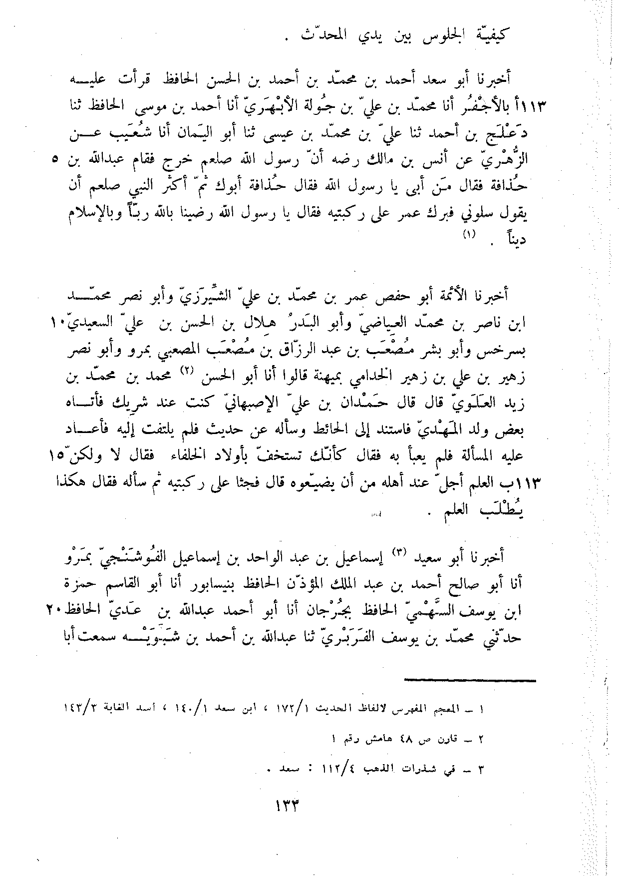 كَيْفِيَّةُ الْجُلُوسِ بَيْنَ يَدَيِ الْمُحَدِّثِ أَخْبَرَنَا أَبُو سَعْدٍ أَحْمَدُ بْنُ مُحَمَّدِ بْنِ أَحْمَدَ بْنِ الْحَسَنِ الْحَافِظُ قَرَأْتُ عَلَيْهِ بِالأَجْفرِ أَنا مُحَمَّدُ بْنُ عَلِيِّ بْنِ جَوْلَةَ الأَبْهَرِيُّ أَنا أَحْمَدُ بْنُ مُوسَى الْحَافِظُ ثَنَا دَعْلَجُ بْنُ أَحْمَدَ ثَنَا عَلِيُّ بْنُ مُحَمَّدِ بْنِ عِيسَى ثَنَا أَبُو الْيَمَانِ أَنا شُعَيْبٌ عَنِ الزُّهْرِيِّ عَنْ أَنَسِ بن مَالك رضه أَنَّ رَسُولَ اللَّهِ صَلَّى اللَّهُ عَلَيْهِ وَسَلَّمَ خَرَجَ فَقَامَ عَبْدُ اللَّهِ بْنُ حُذَافَةَ فَقَالَ مَنْ أَبِي يَا رَسُولِ اللَّهِ فَقَالَ حُذَافَةُ أَبُوكَ ثُمَّ أَكْثَرَ النَّبِيُّ صَلَّى اللَّهُ عَلَيْهِ وَسَلَّمَ إِنَّ يَقُولَ سَلُونِي فَبَرَكَ عُمَرُ عَلَى رُكْبَتَيْهِ فَقَالَ يَا رَسُولَ اللَّهِ رَضِينَا بِاللَّهِ رَبًّا وَبِالإِسْلامِ دِينًا أَخْبَرَنَا الأَئِمَّةُ أَبُو حَفْصٍ عُمَرُ بْنُ مُحَمَّدِ بْنِ عَلِيٍّ الشَّيْرَزِيُّ وَأَبُو نَصْرٍ مُحَمَّدُ بْنُ نَاصِرِ بْنِ مُحَمَّدٍ الْعِيَاضِيُّ وَأَبُو الْبَدْرِ هِلالُ بْنُ الْحَسَنِ بْنُ عَلِيٍّ السَّعْدِيُّ بِسَرْخَسَ وَأَبُو بِشْرٍ مُصْعَبُ بْنُ عَبْدِ الرَّزَّاقِ بْنِ مُصْعَبٍ الْمُصْعَبِيُّ بِمَرْوَ وَأَبُو نَصْرٍ زُهَيْرُ بْنُ عَلِيِّ بْنِ زُهَيْرٍ الْخِدَامِيُّ بِمُيَهْنَةَ قَالُوا أَنا أَبُو الْحَسَنِ مُحَمَّدُ بْنُ مُحَمَّدِ بْنِ زَيْدٍ الْعَلَوِيُّ قَالَ قَالَ حَمْدَانُ بْنُ عَلِيٍّ الأَصْبَهَانِيُّ كُنْتُ عِنْدَ شَرِيكٍ فَأَتَاهُ بَعْضُ وَلَدِ الْمَهْدِي فَاسْتَنَدَ إِلَى الْحَائِطِ وَسَأَلَهُ عَنْ حَدِيثٍ فَلَمْ يَلْتَفِتْ إِلَيْهِ فَأَعَادَ عَلَيْهِ الْمَسْأَلَةَ فَلَمْ يَعْبَأْ بِهِ فَقَالَ كَأَنَّكَ تَسْتَخِفُّ بِأَوْلادِ الْخُلَفَاءِ فَقَالَ لَا وَلَكِنَّ الْعِلْمَ أجل عِنْد أَهله من أَنْ يُضَيِّعُوهُ قَالَ فَجِئْنَا عَلَى رُكْبَتَيْهِ ثُمَّ سَأَلَهُ فَقَالَ هَكَذَا يُطْلَبُ الْعِلْمُ أَخْبَرَنَا أَبُو سَعِيدٍ إِسْمَاعِيلُ بْنُ عَبْدِ الْوَاحِدِ بْنِ إِسْمَاعِيلَ الْفُوشَنْجِيُّ بِمَرْوَ أَنا أَبُو صَالِحٍ أَحْمَدُ بْنُ عَبْدِ الْمَلِكِ الْمُؤَذِّنُ الْحَافِظُ بِنَيْسَابُورَ أَنا أَبُو الْقَاسِمِ حَمْزَةُ بْنُ يُوسُفَ السَّهْمِيُّ الْحَافِظُ بِجُرْجَانَ أَنا أَبُو أَحْمَدَ عَبْدُ اللَّهِ بْنُ عَدِيٍّ الْحَافِظُ حَدَّثَنِي مُحَمَّدُ بْنُ يُوسُفَ الْفَرَبْرِيُّ ثَنَا عَبْدُ اللَّهِ بْنُ أَحْمَدَ بْنِ شَبَوَيْهِ سَمِعْتُ أَبَا