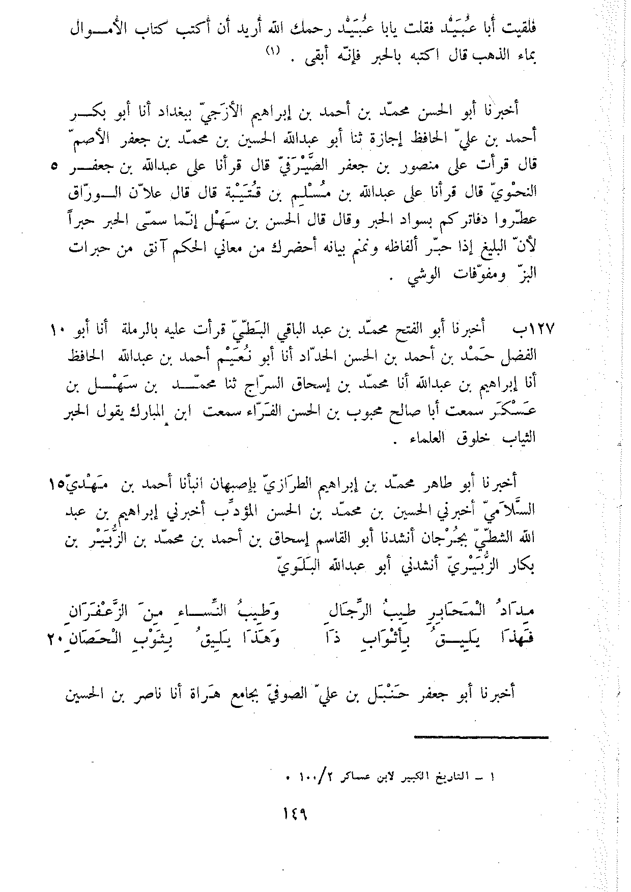 أَخْبَرَنَا أَبُو الْحَسَنِ مُحَمَّدُ بْنُ أَحْمَدَ بْنِ إِبْرَاهِيمَ الأَزَجِيُّ بِبَغْدَادَ أَنا أَبُو بَكْرٍ أَحْمَدُ بْنُ عَلِيٍّ الْحَافِظُ إِجَازَةً ثَنَا أَبُو عَبْدِ اللَّهِ الْحُسَيْنُ بْنُ مُحَمَّدِ بْنِ جَعْفَرٍ الأَصَمُّ قَالَ قَرَأْتُ عَلَى مَنْصُورِ بْنِ جَعْفَرٍ الصَّيْرَفِيُّ قَالَ قَرَأْنَا عَلَى عَبْدِ اللَّهِ بْنِ جَعْفَرٍ النَّحْوِيُّ قَالَ قَرَأْنَا عَلَى عَبْدِ اللَّهِ بْنِ مُسْلِمِ بْنِ قُتَيْبَةَ قَالَ قَالَ عَلانُ الْوَرَّاقُ عَطِّرُوا دَفَاتِرَكُمْ بِسَوَادِ الْحِبْرِ وَقَالَ قَالَ الْحَسَنُ بْنُ سَهْلٍ إِنَّمَا سُمِّيَ الْحِبْرُ حِبْرًا لأَنَّ الْبَلِيغَ إِذَا حَبَّرَ أَلْفَاظَهُ وَنَمْنَمَ بَيَانَهُ أَحْضَرَكَ مِنْ مَعَانِي الْحِكَمِ آنق من حبرات الْبَز ومفوقات الْوَشْيِ