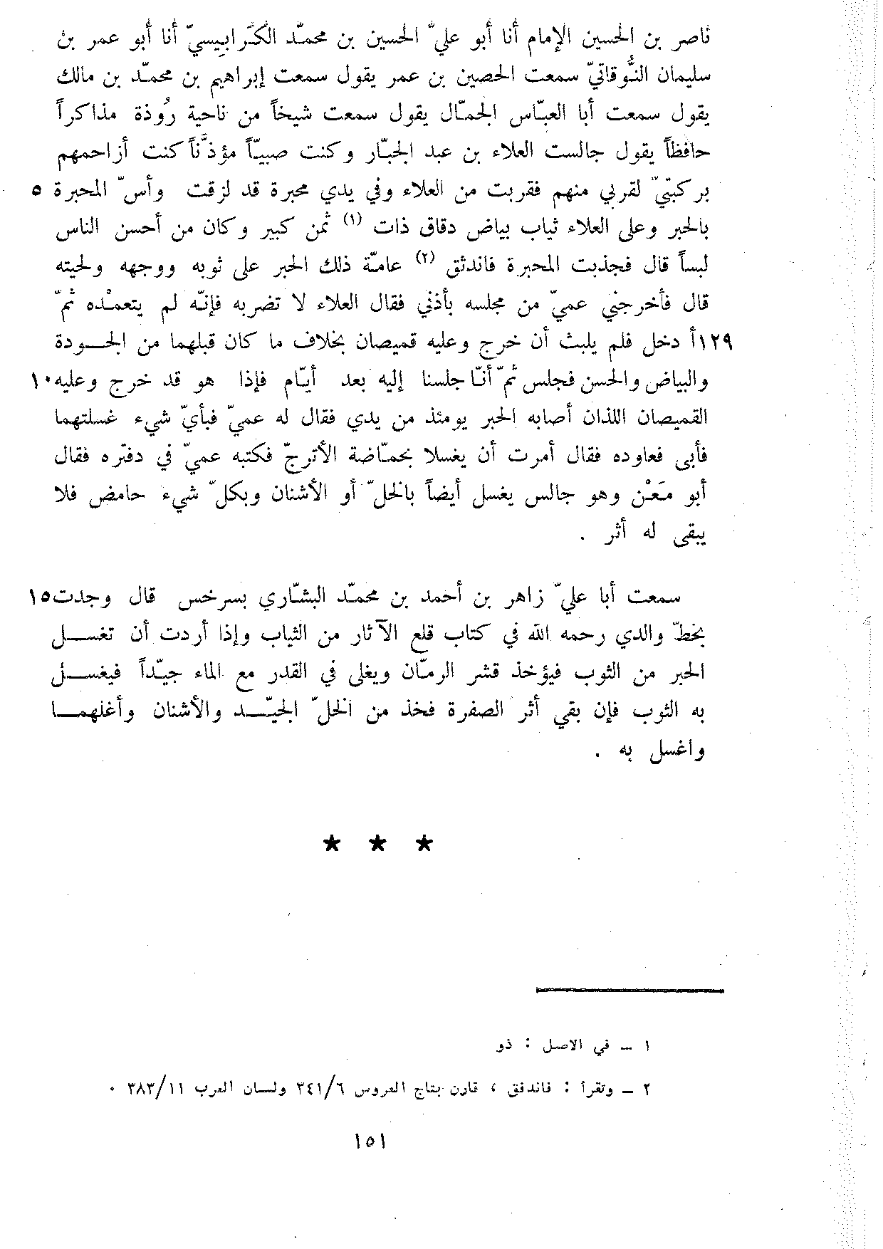 سَمِعْتُ أَبَا عَلِيَّ زَاهِرَ بْنَ أَحْمَدَ بْنِ مُحَمَّدٍ الْبِشَارِيَّ بِسَرْخَسَ قَالَ وَجَدْتُ بِخَطِّ وَالِدِي رَحِمَهُ اللَّهُ فِي كِتَابِ قلْعِ الآثَارِ مِنَ الثِّيَابِ وَإِذَا أَرَدْتُ أَنْ تَغْسِلَ الْحِبْرَ مِنَ الثَّوْبِ فَيُؤْخَذُ قِشْرُ الرُّمَّانِ وَيُغْلَى فِي الْقِدْرِ مَعَ الْمَاءِ جَيِّدًا فَيُغْسَلُ بِهِ الثَّوْبُ فَإِنْ بَقِيَ أَثَرُ الصُّفْرَةِ فَخُذْ مِنَ الْخَلِّ الْجَيِّدِ وَالأَشْنَانِ وَأَغْلِهِمَا وَاغْسِلْ بِهِ