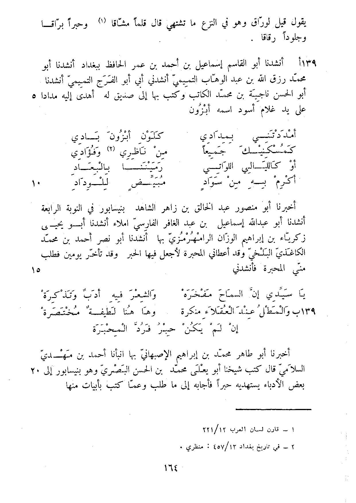 أَخْبَرَنَا أَبُو مَنْصُورٍ عَبْدُ الْخَالِقِ بْنُ زَاهِرٍ الشَّاهِدُ بِنَيْسَابُورَ فِي النَّوْبَةِ الرَّابِعَةِ أَنْشَدَنَا أَبُو عَبْدِ اللَّهِ إِسْمَاعِيلُ بْنُ عَبْدِ الْغَافِرِ الْفَارِسِيُّ إِمْلاءً أَنْشَدَنَا أَبُو يَحْيَى زَكَرِيَّا بْنُ إِبْرَاهِيمَ الرَّامَهُرْمُزِيُّ بِهَا أَنْشَدَنَا أَبُو نَصْرٍ أَحْمد بن مُحَمَّد الكاغدي الْبَلْخِيُّ وَقَدْ أَعْطَانِيَ الْمَحْبَرَةَ لأَجْعَلَ فِيهَا الْحِبْرَ وَقَدْ تَأَخَّرَ يَوْمَيْنِ فَطَلَبَ مِنِّي الْمَحْبَرَةَ فَأَنْشَدَنِي