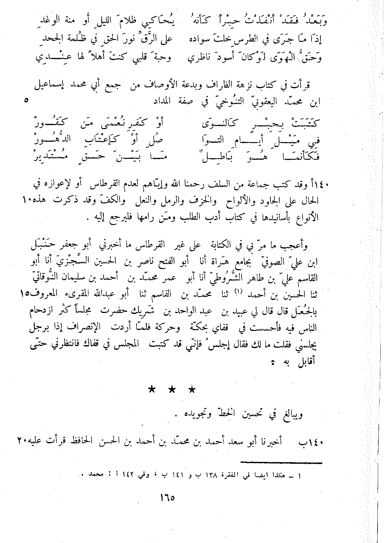 قَرَأْتُ فِي كِتَابِ نُزْهَةِ الظُّرَّافِ وَبِدْعَةِ الأَوْصَافِ مِنْ جَمْعِ أَبِي مُحَمَّدٍ إِسْمَاعِيلَ بْنِ مُحَمَّدٍ الْيَعْقُوبِيِّ التَّنُوخِيِّ فِي صِفَةِ الْمِدَادِ