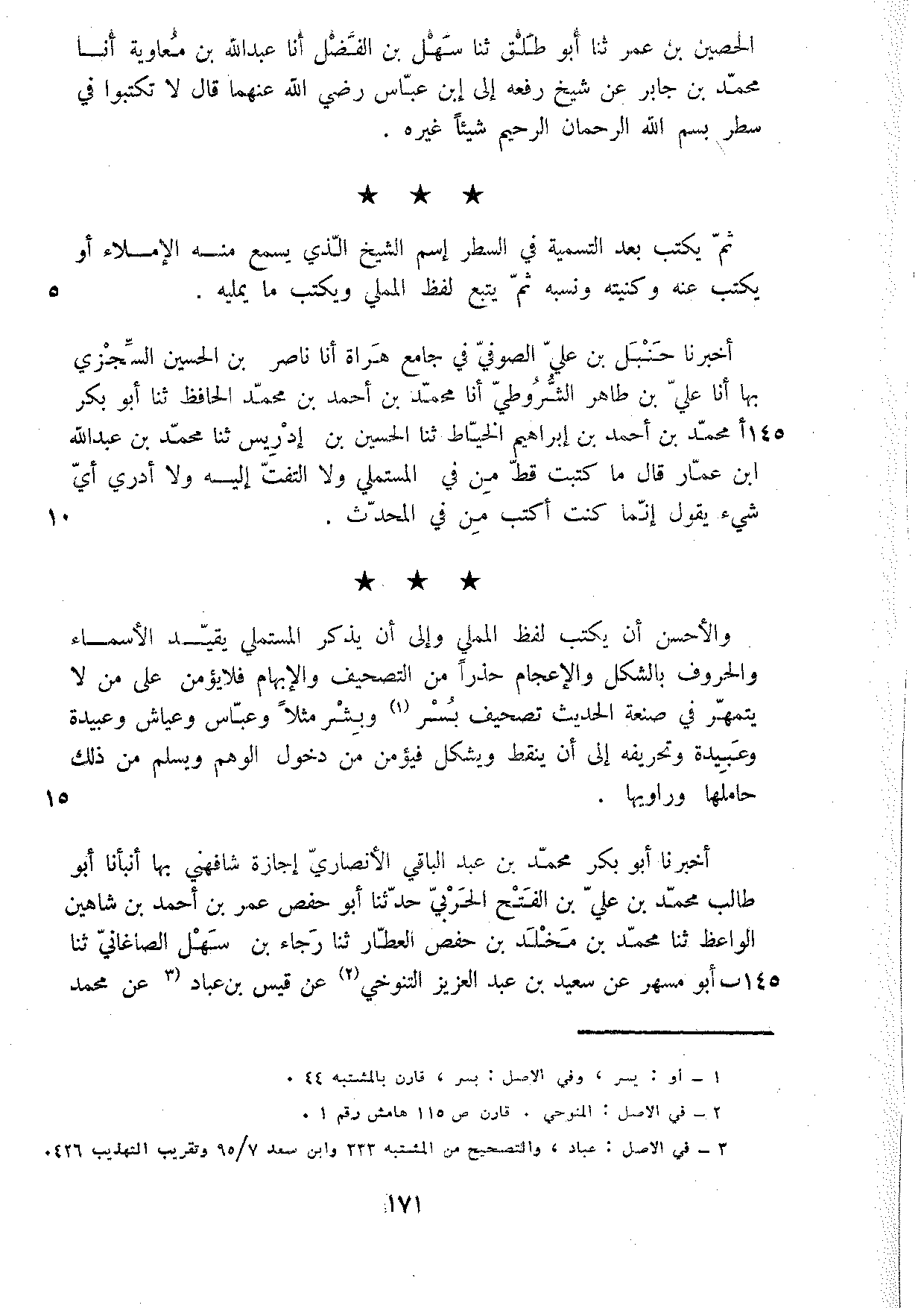أَخْبَرَنَا حَنْبَلُ بْنُ عَلِيٍّ الصُّوفِيُّ فِي جَامِعِ هَرَاةَ أَنا نَاصِرُ بْنُ الْحُسَيْنِ السِّجْزِيُّ بِهَا أَنا عَلِيُّ بْنُ طَاهِرٍ الشُّرُوطِيُّ أَنا مُحَمَّدُ بْنُ أَحْمَدَ بْنِ مُحَمَّدٍ الْحَافِظُ ثَنَا أَبُو بَكْرٍ مُحَمَّدُ بْنُ أَحْمَدَ بْنِ إِبْرَاهِيمَ الْخَيَّاطُ ثَنَا الْحُسَيْنُ بْنُ إِدْرِيسَ ثَنَا مُحَمَّدُ بْنُ عَبْدِ اللَّهِ بْنِ عَمَّارٍ قَالَ مَا كَتَبْتُ قَطْ مِنْ فِيِّ الْمُسْتَمْلِي وَلا الْتَفَتُّ إِلَيْهِ وَلا أَدْرِي أَيُّ شَيْءٍ يَقُولُ إِنَّمَا كُنْتُ أَكْتُبُ مِنْ فِيِّ الْمُحَدِّثِ وَالأَحْسَنُ أَنْ يَكْتُبَ لَفْظَ الْمُمَلِّي وَإِلَى أَنْ يَذْكُرَ الْمُسْتَمْلِي يُقَيِّدُ الأَسْمَاءَ وَالْحُرُوفَ بِالشَّكْلِ وَالإِعْجَامِ حَذَرًا مِنَ التَّصْحِيفِ وَالإِبْهَامِ فَلا يُؤْمَنُ عَلَى مَنْ لَا يَتَمَهَّرُ فِي صَنْعَةِ الْحَدِيثِ تَصْحِيفُ بُسْرٍ وَبِشْرٍ مَثَلا وَعَبَّاسٍ وَعَيَّاشٍ وَعُبَيْدَةَ وَعَبِيدَةَ وَتَحْرِيفُهُ إِلَى أَنْ يُنَقِّطَ وَيُشَكِّلَ فَيُؤْمَنَ مِنْ دُخُولِ الْوَهْمِ وَيَسْلَمَ مِنْ ذَلِكَ حَامِلُهَا وَرَاوِيهَا