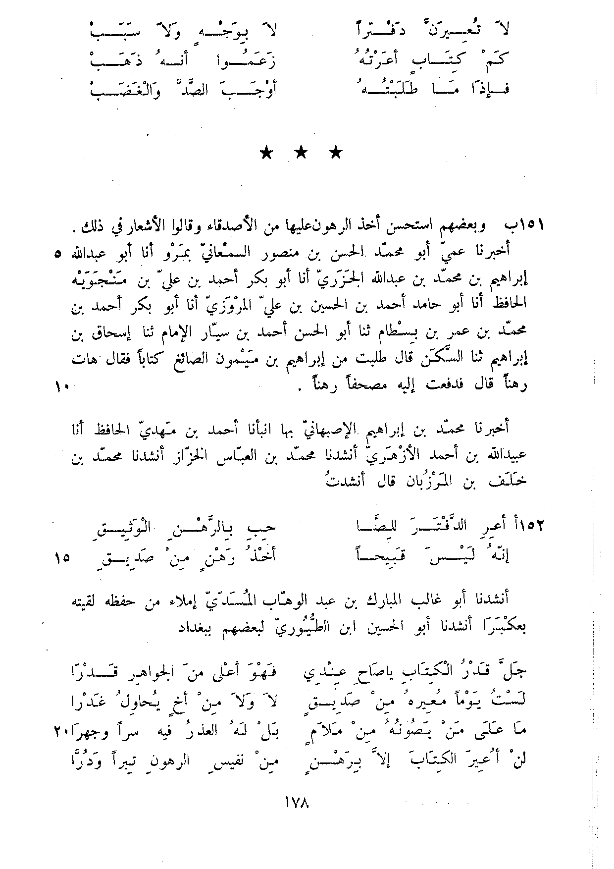 بَلْ لَهُ الْعُذْرُ فِيهِ سِرًّا وَجَهْرَا ... لَنْ أُعِيرَ الْكِتَابَ إِلا بِرْهَنٍ ... مِنْ نَفِيسِ الرُّهُونِ تِبْرًا وَدُرَّا