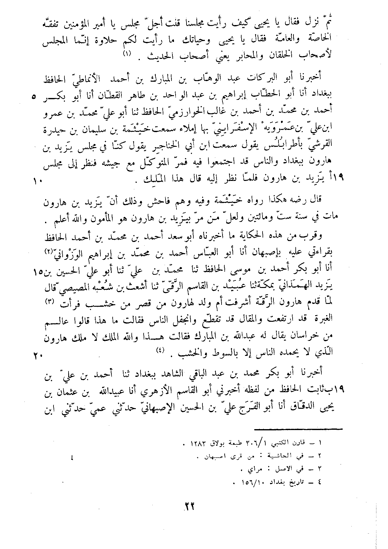 أَخْبَرَنَا أَبُو الْبَرَكَاتِ عَبْدُ الْوَهَّابِ بْنُ الْمُبَارَكِ بْنِ أَحْمَدَ الأَنْمَاطِيُّ الْحَافِظُ بِبَغْدَادَ أَنا أَبُو الْحَطَّابِ إِبْرَاهِيمُ بْنُ عَبْدِ الْوَاحِدِ بْنِ طَاهِرٍ الْقَطَّانُ أَنا أَبُو بَكْرٍ أَحْمَدُ بْنُ مُحَمَّدِ بْنِ غَالِبٍ الْخَوَارِزْمِيُّ الْحَافِظُ ثَنَا أَبُو عَلِيٍّ مُحَمَّدُ بْنُ عَمْرِو بْنِ عَلِيِّ بْنِ عَمْرَوَيْهِ الإِسْفَرَايِنِيُّ بِهَا إِمْلاءً سَمِعْتُ خَيْثَمَةَ بْنَ سُلَيْمَانَ بْنِ حَيْدَرَةَ الْقُرَشِيَّ بِأَطْرَابُلْسَ يَقُولُ سَمِعْتُ بن أَبِي الْخَنَاجِرِ يَقُولُ كُنَّا فِي مَجْلِسٍ يَزِيدَ بْنِ هَارُونَ بِبَغْدَادَ وَالنَّاسُ قَدِ اجْتَمَعُوا فِيهِ فَمَرَّ الْمُتَوَكِّلُ مَعَ جَيْشِهِ فَنَظَرَ إِلَى مَجْلِسِ يَزِيدَ بْنِ هَارُونَ فَلَمَّا نَظَرَ إِلَيْهِ قَالَ هَذَا الْمُلْكُ قَالَ رضه هَكَذَا رَوَاهُ خَيْثَمَةُ وَفِيهِ وَهْمٌ فَاحِشٌ وَذَلِكَ أَنَّ يَزِيدَ بْنَ هَارُونَ مَاتَ فِي سَنَةِ سِتٍّ وَمِائَتَيْنِ وَلَعَّلَ مَنْ مَرَّ بِيَزِيدَ بْنِ هَارُونَ هُوَ الْمَأْمُونُ وَاللَّهُ أَعْلَمُ وَقُرْبٌ مِنْ هَذِهِ الْحِكَايَةِ مَا أَخْبَرَنَاهُ أَبُو سَعْدٍ أَحْمَدُ بْنُ مُحَمَّدِ بْنِ أَحْمَدَ الْحَافِظُ بِقِرَاءَتِي عَلَيْهِ بِأَصْبَهَانَ أَنا أَبُو الْعَبَّاسِ أَحْمَدَ بْنَ مُحَمَّدِ بْنِ إِبْرَاهِيمَ الْوَزْوَانِيُّ أَنا أَبُو بَكْرٍ أَحْمَدُ بْنُ مُوسَى الْحَافِظُ ثَنَا مُحَمَّدُ بْنُ عَلِيٍّ ثَنَا أَبُو عَلِيٍّ الْحُسَيْنُ بْنُ يَزِيدَ الْهَمَذَانِيُّ بِمَكَّةَ ثَنَا عُبَيْدُ بْنُ الْقَاسِمِ الرِّقِّيُّ ثَنَا أَشْعَثُ بْنُ شُعْبَةَ المصِّيصِي قَالَ الْغَبْرَةَ قَدِ ارْتَفَعَتْ وَالْمَقَالَ قَدْ تَقَطَّعَ وَانْجَفَلَ النَّاسُ فَقَالَتْ مَا هَذَا قَالُوا عَالِمٌ مِنْ خُرَاسَانَ يُقَالَ لَهُ عَبْدُ اللَّهِ بْنُ الْمُبَارَكِ فَقَالَتْ هَذَا وَاللَّهِ الْمُلْكُ لَا مُلْكُ هَارُونَ الَّذِي لَا يَحْمَدُهُ النَّاسُ إِلا بِالسُّوطِ وَالْخَشَبِ