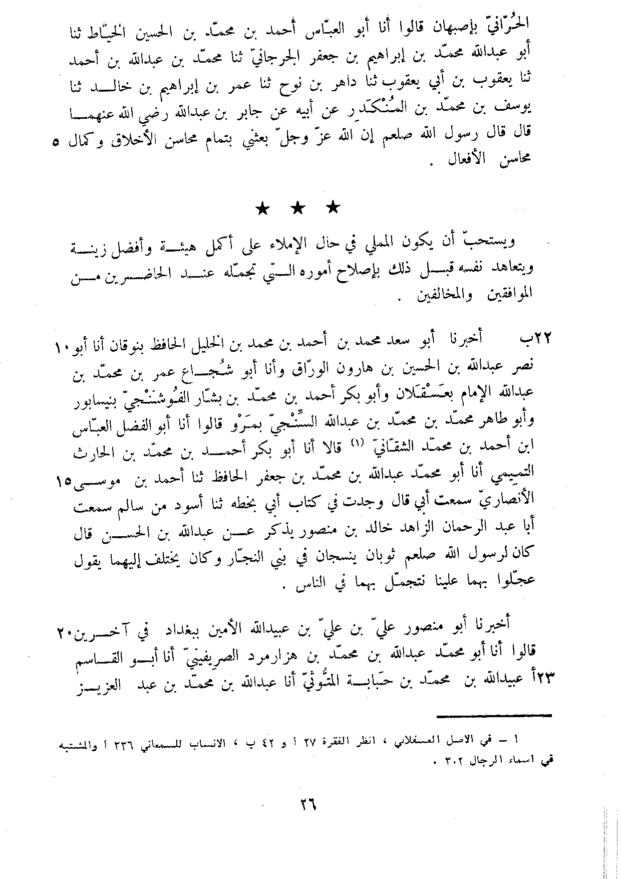 أَخْبَرَنَا أَبُو سَعْدٍ مُحَمَّدُ بْنُ أَحْمَدَ بْنِ مُحَمَّدِ بْنِ الْخَلِيلِ الْحَافِظُ بِنَوْقَانَ أَنا أَبُو نَصْرٍ عَبْدُ اللَّهِ بْنُ الْحُسَيْنِ بْنِ هَارُونَ الْوَرَّاقُ وَأَنَا أَبُو شُجَاعٍ عُمَرُ بْنُ مُحَمَّدِ بْنِ عَبْدِ اللَّهِ الإِمَامُ بِعَسْقَلانَ وَأَبُو بَكْرٍ أَحْمَدُ بْنُ مُحَمَّدِ بْنِ بَشَّارٍ الْفُوشَنْجِيُّ بِنَيْسَابُورَ وَأَبُو طَاهِرٍ مُحَمَّدُ بْنُ مُحَمَّدِ بْنِ عَبْدِ اللَّهِ السِّنْجِيُّ بِمَرْوَ قَالُوا أَنا أَبُو الْفَضْلِ الْعَبَّاسُ بْنُ أَحْمَدَ بْنِ مُحَمَّدٍ الشَّقَّانِيُّ قَالَا أَنا أَبُو بَكْرٍ أَحْمَدُ بْنُ مُحَمَّدِ بْنِ الْحَارِثِ التَّمِيمِيُّ أَنا أَبُو مُحَمَّدٍ عَبْدُ اللَّهِ بْنُ مُحَمَّدِ بْنِ جَعْفَرٍ الْحَافِظُ ثَنَا أَحْمَدُ بْنُ مُوسَى الأَنْصَارِيُّ سَمِعْتُ أَبِي قَالَ وَجَدْتُ فِي كِتَابِ أَبِي بِخَطِّهِ ثَنَا أَسْوَدٌ مِنْ سَالِمٍ سَمِعْتُ أَبَا عبد الرَّحْمَن الزَّاهِد خَالِدَ بْنَ مَنْصُورٍ يَذْكُرُ عَنْ عَبْدِ اللَّهِ بْنِ الْحَسَنِ قَالَ كَانَ لِرَسُولِ اللَّهِ صَلَّى اللَّهُ عَلَيْهِ وَسَلَّمَ ثَوْبَانِ يُنْسَجَانِ فِي بَنِي النَّجَّارِ وَكَانَ يَخْتَلِفُ إِلَيْهِمَا يَقُولُ عَجِّلُوا بِهِمَا عَلَيْنَا نَتَجَمَّلُ بِهِمَا فِي النَّاسِ