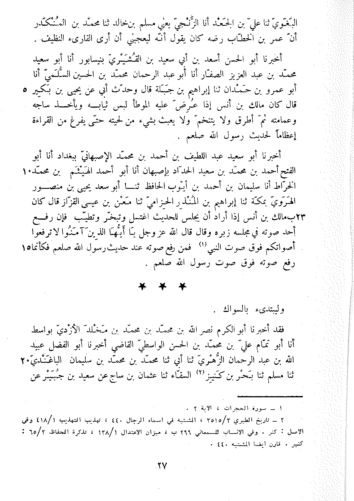 أَخْبَرَنَا أَبُو سَعِيدٍ عَبْدُ اللَّطِيفِ بْنُ أَحْمَدَ بْنِ مُحَمَّدٍ الأَصْبَهَانِيُّ بِبَغْدَادَ أَنا أَبُو الْفَتْحِ أَحْمَدُ بْنُ مُحَمَّدِ بْنِ سَعِيدٍ الْحَدَّادُ بِأَصْبَهَانَ أَنا أَبُو أَحْمَدَ الْهَيْثَمُ بْنُ مُحَمَّدٍ الْخَرَّاطُ أَنا سُلَيْمَانُ بْنُ أَحْمَدَ بْنِ أَيُّوبَ الْحَافِظُ ثَنَا أَبُو سَعْدٍ يَحْيَى بْنُ مَنْصُورٍ الْهَرَوِيُّ بِمَكَّةَ ثَنَا إِبْرَاهِيمُ بْنُ الْمُنْذِرِ الْحِزَامِيُّ ثَنَا مَعْنُ بْنُ عِيسَى الْقَزَّازُ قَالَ كَانَ مَالِكُ بْنُ أَنَسٍ إِذَا أَرَادَ أَنْ يَجْلِسَ لِلْحَدِيثِ اغْتَسَلَ وَتَبَخَّرَ وَتَطَيَّبَ فَإِنْ رَفَعَ أَحَدٌ صَوْتَهُ فِي مَجْلِسِهِ زبره وقَالَ قَالَ اللَّهُ عَزَّ وَجَلَّ يَا أَيهَا الَّذِينَ آمَنُوا لَا تَرْفَعُوا أَصْوَاتَكُمْ فَوق صَوت النَّبِي فَمَنْ رَفَعَ صَوْتَهُ عِنْدَ حَدِيثِ رَسُولُ اللَّهِ صَلَّى اللَّهُ عَلَيْهِ وَسَلَّمَ فَكَأَنَّمَا رَفَعَ صَوْتَهُ فَوْقَ صَوْتِ رَسُولِ اللَّهِ صَلَّى اللَّهُ عَلَيْهِ وَسلم وليبتدىء بِالسُّوَاكِ
