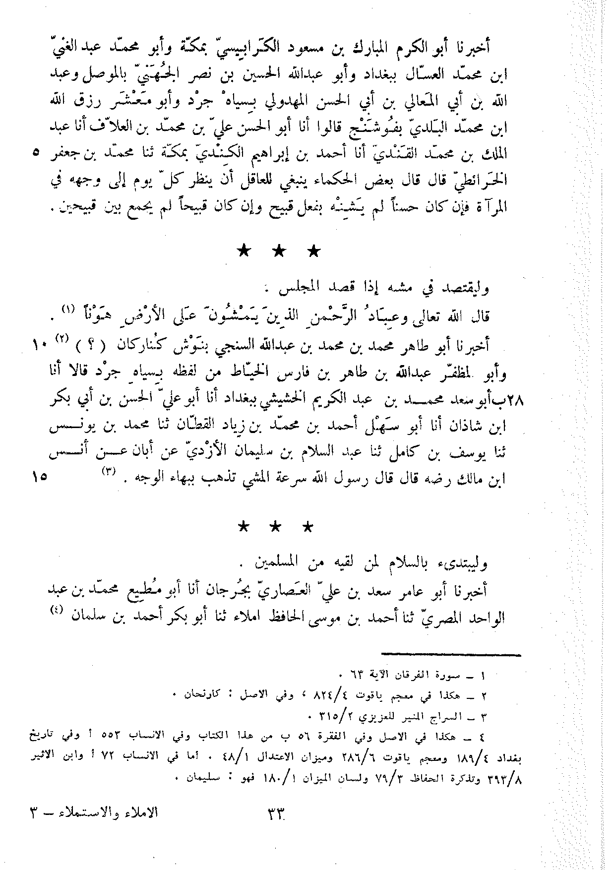أَخْبَرَنَا أَبُو طَاهِرٍ مُحَمَّدُ بْنُ مُحَمَّدِ بْنِ عَبْدِ اللَّهِ السِّنْجِيُّ بنوش كُنَّا ركان وَأَبُو الْمُظَفَّرِ عَبْدُ اللَّهِ بْنُ طَاهِرِ بْنِ فَارِسٍ الْخَيَّاطُ مِنْ لَفْظِهِ بِسِيَاهِ جَرْدَ قَالَا أَنا أَبُو سَعْدٍ مُحَمَّدُ بْنُ عَبْدِ الْكَرِيمِ الْخُشَيْشِيُّ بِبَغْدَادَ أَنا أَبُو عَلِيٍّ الْحَسَنُ بْنُ أَبِي بَكْرِ بْنِ شَاذَانَ أَنا أَبُو سَهْلٍ أَحْمَدُ بْنُ مُحَمَّدِ بْنِ زِيَادٍ الْقَطَّانُ ثَنَا مُحَمَّدُ بْنُ يُونُسَ ثَنَا يُوسُفُ بْنُ كَامِلٍ ثَنَا عَبْدُ السَّلامِ بْنُ سُلَيْمَانَ الأَزْدِيُّ عَنْ أَبَانٍ عَنْ أَنَسِ بْنِ مَالك رضه قَالَ قَالَ رَسُول الله سُرْعَةُ الْمَشْيِ تُذْهِبُ بِبَهَاءِ الْوَجْهِ وليبتدىء بِالسَّلامِ لِمَنْ لَقِيَهُ مِنَ الْمُسْلِمِينَ