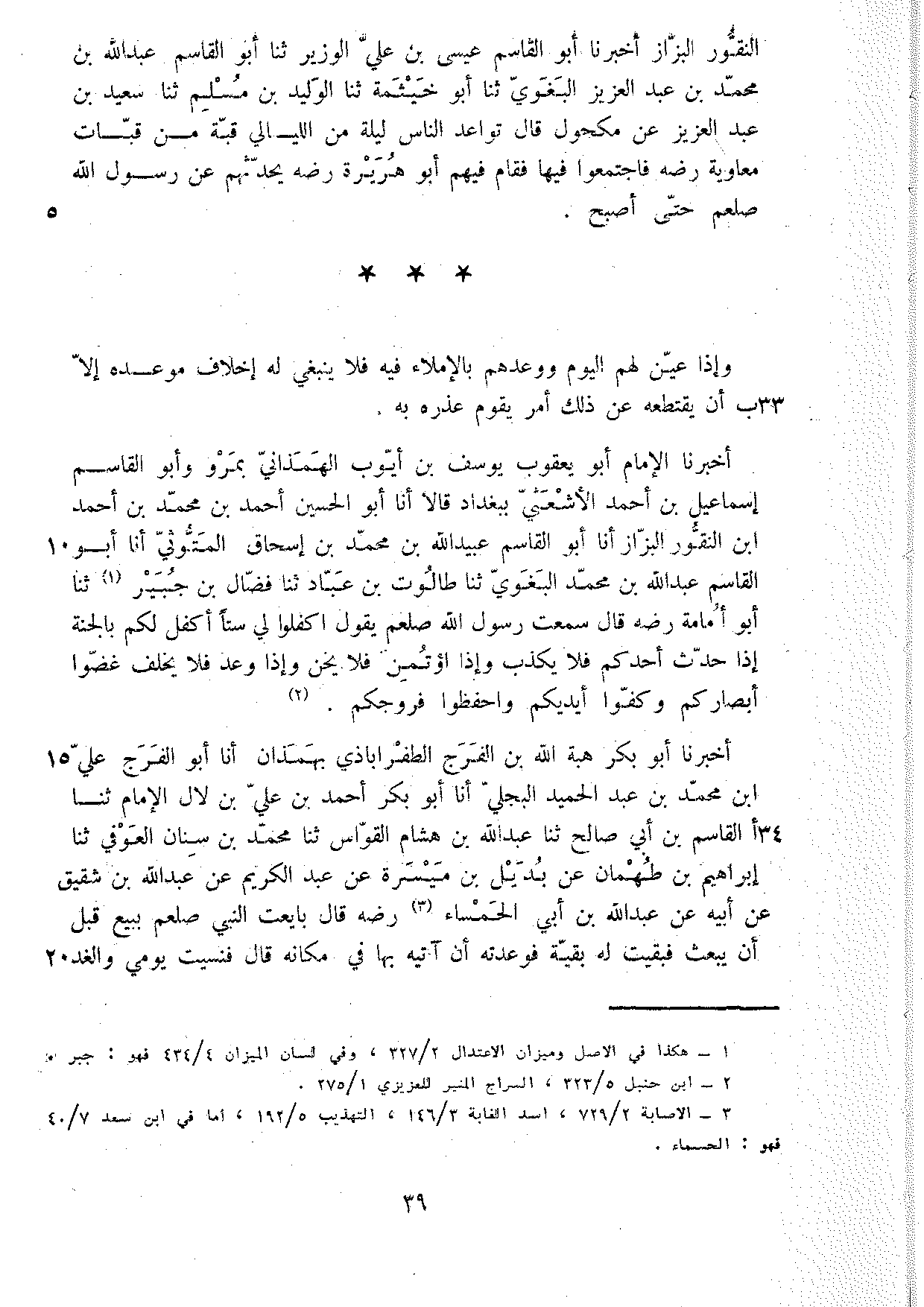أَخْبَرَنَا أَبُو بَكْرٍ هِبَةُ اللَّهِ بْنُ الْفَرَجِ الطَّفْرَابَاذِيُّ بِهَمَذَانَ أَنا أَبُو الْفَرَجِ عَلِيُّ بْنُ مُحَمَّدِ بْنِ عَبْدِ الْحَمِيدِ الْبَجْلِيُّ أَنا أَبُو بَكْرٍ أَحْمَدُ بْنُ عَلِيِّ بْنِ لال الإِمَامُ ثَنَا الْقَاسِمُ بْنُ أَبِي صَالِحٍ ثَنَا عَبْدُ اللَّهِ بْنُ هِشَامٍ الْقَوَّاسُ ثَنَا مُحَمَّدُ بْنُ سِنَانَ الْعُوفِيُّ ثَنَا إِبْرَاهِيمُ بْنُ طَهْمَانَ عَنْ بُدَيْلِ بْنِ مَيْسَرَةَ عَنْ عَبْدِ الْكَرِيمِ عَنْ عَبْدِ اللَّهِ بْنِ شَقِيقٍ عَنْ أَبِيهِ عَنْ عَبْدِ اللَّهِ بْنِ أَبِي الحمساء رضه قَالَ بَايَعْتُ النَّبِيَّ صَلَّى اللَّهُ عَلَيْهِ وَسَلَّمَ بِبَيْعٍ قَبْلَ أَنْ يُبْعَثَ فَبَقِيَتْ لَهُ بَقِيَّةٌ فَوَعَدْتُهُ أَنْ آتِيهِ بِهَا فِي مَكَانِهِ قَالَ فَنَسِيتُ يَوْمِي وَالْغَدَ فَأَتَيْتُهُ فِي الْيَوْمِ الثَّالِثِ وَهُوَ فِي مَكَانَهُ قَالَ فَقَالَ يَا نَبِي لَقَدْ شَقَقْتُ عَلَيَّ أَنَا هَا هُنَا مُنْذُ ثَلاثٍ أَنْتَظِرُكَ