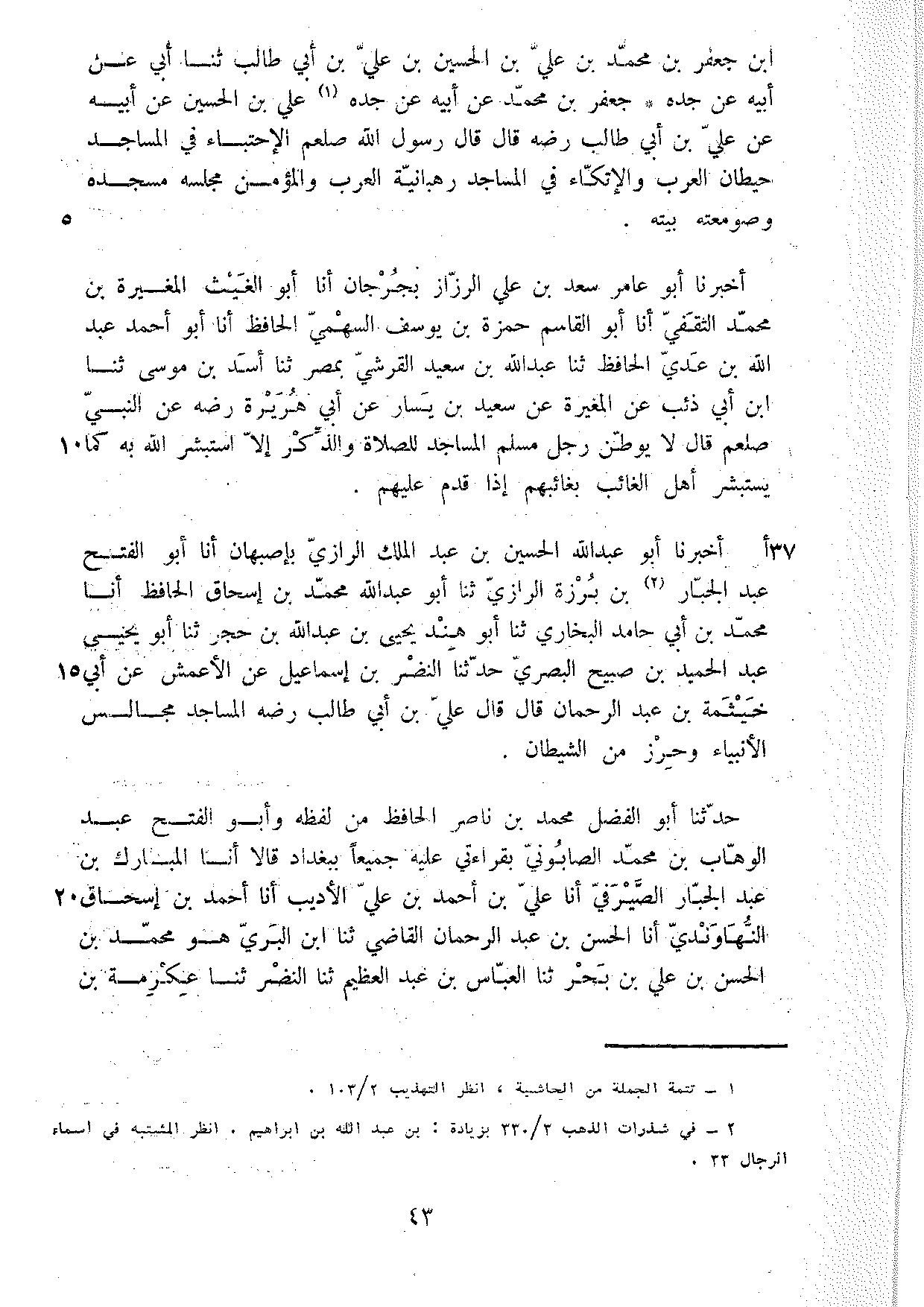 أَخْبَرَنَا أَبُو عَبْدِ اللَّهِ الْحُسَيْنُ بْنُ عَبْدِ الْمَلِكِ الرَّازِيُّ بِأَصْبَهَانَ أَنا أَبُو الْفَتْحِ عَبْدُ الْجَبَّارِ بْنُ بَرَزَةَ الرَّازِيُّ ثَنَا أَبُو عَبْدِ اللَّهِ مُحَمَّدُ بْنُ إِسْحَاقَ الْحَافِظُ أَنا مُحَمَّدُ بْنُ أَبِي حَامِدٍ الْبُخَارِيُّ ثَنَا أَبُو هِنْدٍ يَحْيَى بْنُ عَبْدِ اللَّهِ بْنِ حَجَرٍ ثَنَا أَبُو يَحْيَى عَبْدُ الْحَمِيدِ بْنُ صُبَيْحٍ الْبَصْرِيُّ حَدَّثَنَا النَّضْرُ بْنُ إِسْمَاعِيلَ عَنِ الأَعْمَشِ عَنْ أَبِي خَيْثَمَةَ بْنِ عَبْدِ الرَّحْمَنِ قَالَ قَالَ عَلِيُّ بْنُ أبي طَالب رضه الْمَسَاجِدُ مَجَالِسُ الأَنْبِيَاءِ وَحِرْزٌ مِنَ الشَّيْطَانِ