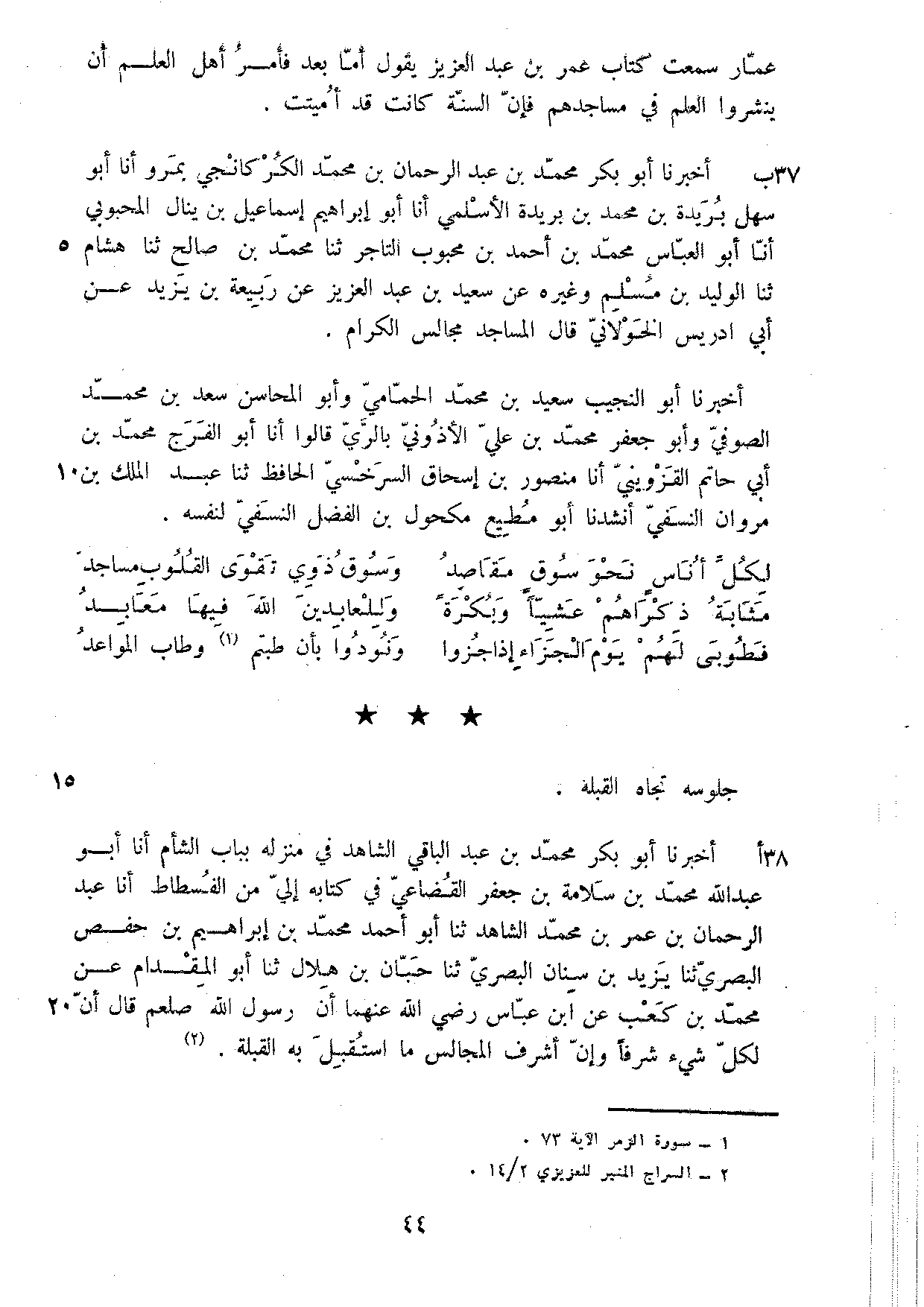 أَخْبَرَنَا أَبُو بَكْرٍ مُحَمَّدُ بْنُ عَبْدِ الرَّحْمَنِ بْنِ مُحَمَّدٍ الْكُرْكَانْجِيُّ بِمَرْوَ أَنا أَبُو سَهْلٍ بُرَيْدَةُ بْنُ مُحَمَّدِ بْنِ بُرَيْدَةَ الأَسْلَمِيُّ أَنا أَبُو إِبْرَاهِيمَ إِسْمَاعِيلُ بْنُ يَنَالَ الْمَحْبُوبِيُّ أَنا أَبُو الْعَبَّاسِ مُحَمَّدُ بْنُ أَحْمَدَ بْنِ مَحْبُوبٍ التَّاجِرُ ثَنَا مُحَمَّدُ بْنُ صَالِحٍ ثَنَا هِشَامٌ ثَنَا الْوَلِيدُ بْنُ مُسْلِمٍ وَغَيْرُهُ عَنْ سَعِيدِ بْنِ عَبْدِ الْعَزِيزِ عَنْ رَبِيعَةَ بْنِ يَزِيدَ عَنْ أَبِي إِدْرِيسَ الْخَوْلانِيُّ قَالَ الْمَسَاجِد مجَالِس الْكِرَام