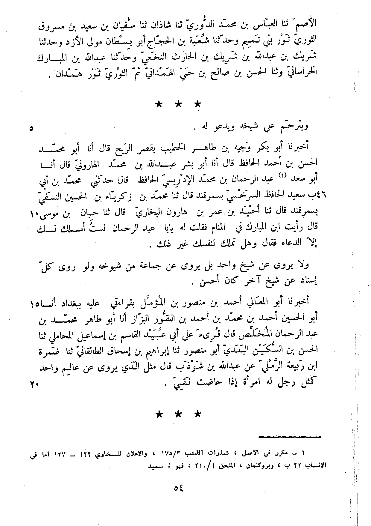 أَخْبَرَنَا أَبُو بَكْرٍ وَجِيهُ بْنُ طَاهِرٍ الْخَطِيبُ بِقَصْرِ الرِّيحِ قَالَ أَنا أَبُو مُحَمَّدٍ الْحَسَنُ بْنُ أَحْمَدَ الْحَافِظُ قَالَ أَنا أَبُو بِشْرٍ عَبْدُ اللَّهِ بْنُ مُحَمَّدٍ الْهَارُونِيُّ قَالَ أَنا أَبُو سَعْدٍ عَبْدُ الرَّحْمَنِ بْنُ مُحَمَّدٍ الإِدْرِيسِيُّ الْحَافِظُ قَالَ حَدَّثَنِي مُحَمَّدُ بْنُ أَبِي سَعِيدٍ الْحَافِظُ السَّرْخَسِيُّ بِسَمَرَقَنْدَ قَالَ ثَنَا مُحَمَّدُ بْنُ زَكَرِيَّا بْنِ الْحُسَيْنِ النَّسَفِيُّ بِسَمَرَقَنْدَ قَالَ ثَنَا أُحَيْدُ بْنُ عُمَرَ بْنِ هَارُونَ الْبُخَارِيُّ قَالَ ثَنَا حِبَّانُ بن مُوسَى قَالَ رَأَيْت بن الْمُبَارَكِ فِي الْمَنَامِ فَقُلْتُ لَهُ يابا عَبْدِ الرَّحْمَنِ لَسْتُ أَمْلُكُ لَكَ إِلا الدُّعَاءَ فَقَالَ وَهَلْ تَمْلِكُ لِنَفْسِكَ غَيْرَ ذَلِكَ وَلا يَرْوِي عَنْ شَيْخٍ وَاحِدٍ بَلْ يَرْوِي عَنْ جَمَاعَةٍ مِنْ شُيُوخِهِ وَلَوْ رَوَى كُلَّ إِسْنَادٍ عَنْ شَيْخٍ آخَرَ كَانَ أَحْسَنَ