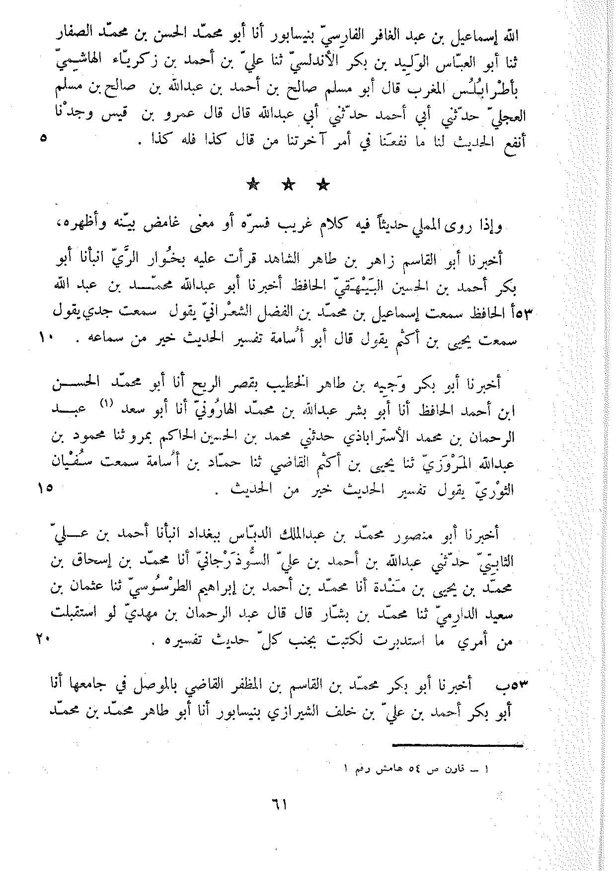 أَخْبَرَنَا أَبُو بَكْرٍ وَجِيهُ بْنُ طَاهِرٍ الْخَطِيبُ بِقَصْرِ الرِّيحِ أَنا أَبُو مُحَمَّدٍ الْحَسَنُ بْنُ أَحْمَدَ الْحَافِظُ أَنا أَبُو بِشْرٍ عَبْدُ اللَّهِ بْنُ مُحَمَّدٍ الْهَارُونِيُّ أَنا أَبُو سَعْدٍ عَبْدُ الرَّحْمَنِ بْنُ مُحَمَّدٍ الإِسْتِرَابَاذِيُّ حَدَّثَنِي مُحَمَّدُ بْنُ الْحُسَيْنِ الْحَاكِمُ بِمَرْوَ ثَنَا مَحْمُودُ بْنُ عَبْدِ اللَّهِ الْمَرْوَزِيُّ ثَنَا يَحْيَى بْنُ أَكْثَمَ الْقَاضِي ثَنَا حَمَّادُ بْنُ أُسَامَةَ سَمِعْتُ سُفْيَانَ الثَّوْرِيَّ يَقُولُ تَفْسِيرُ الْحَدِيثِ خَيْرٌ مِنَ الْحَدِيثِ