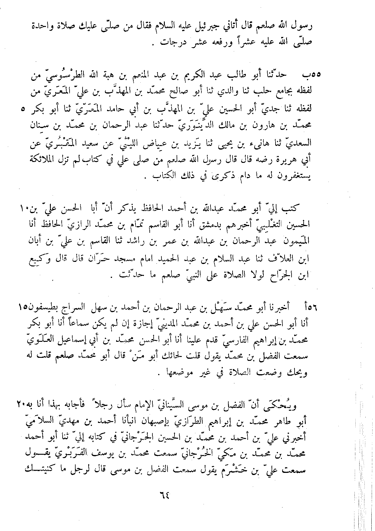 حَدَّثَنَا أَبُو طَالِبٍ عَبْدُ الْكَرِيمِ بْنُ عَبْدِ الْمُنْعِمِ بْنِ هِبَةِ اللَّهِ الطَّرْسُوسِيُّ مِنْ لَفْظِهِ بِجَامِعِ حَلَبٍ ثَنَا وَالِدِي ثَنَا أَبُو صَالِحٍ مُحَمَّدُ بْنُ الْمُهَذَّبِ بْنِ عَلِيٍّ الْمَعَرِّيُّ مِنْ لَفْظِهِ ثَنَا جَدِّي أَبُو الْحُسَيْنِ عَلِيُّ بْنُ الْمُهَذَّبِ بْنِ أَبِي حَامِدٍ الْمَعَرِّيُّ ثَنَا أَبُو بَكْرٍ مُحَمَّدُ بْنُ هَارُونَ بْنِ مَالِكٍ الدَّيْنَوَرِيُّ حَدَّثَنَا عَبْدُ الرَّحْمَنِ بْنُ مُحَمَّدِ بْنِ سِنَانَ السَّعْدِيُّ ثَنَا هَانِئُ بْنُ يَحْيَى ثَنَا يَزِيدُ بْنُ عِيَاضٍ اللَّيْثِيُّ عَنْ سَعِيدٍ الْمَقْبَرِيِّ عَنْ أبي هُرَيْرَة رضه قَالَ قَالَ رَسُولُ اللَّهِ صَلَّى اللَّهُ عَلَيْهِ وَسَلَّمَ مَنْ صَلَّى عَلَيَّ فِي كِتَابٍ لَمْ تَزَلِ الْمَلائِكَةُ يَسْتَغْفِرُونَ لَهُ مَا دَامَ ذِكْرَى فِي ذَلِكَ الْكِتَابِ