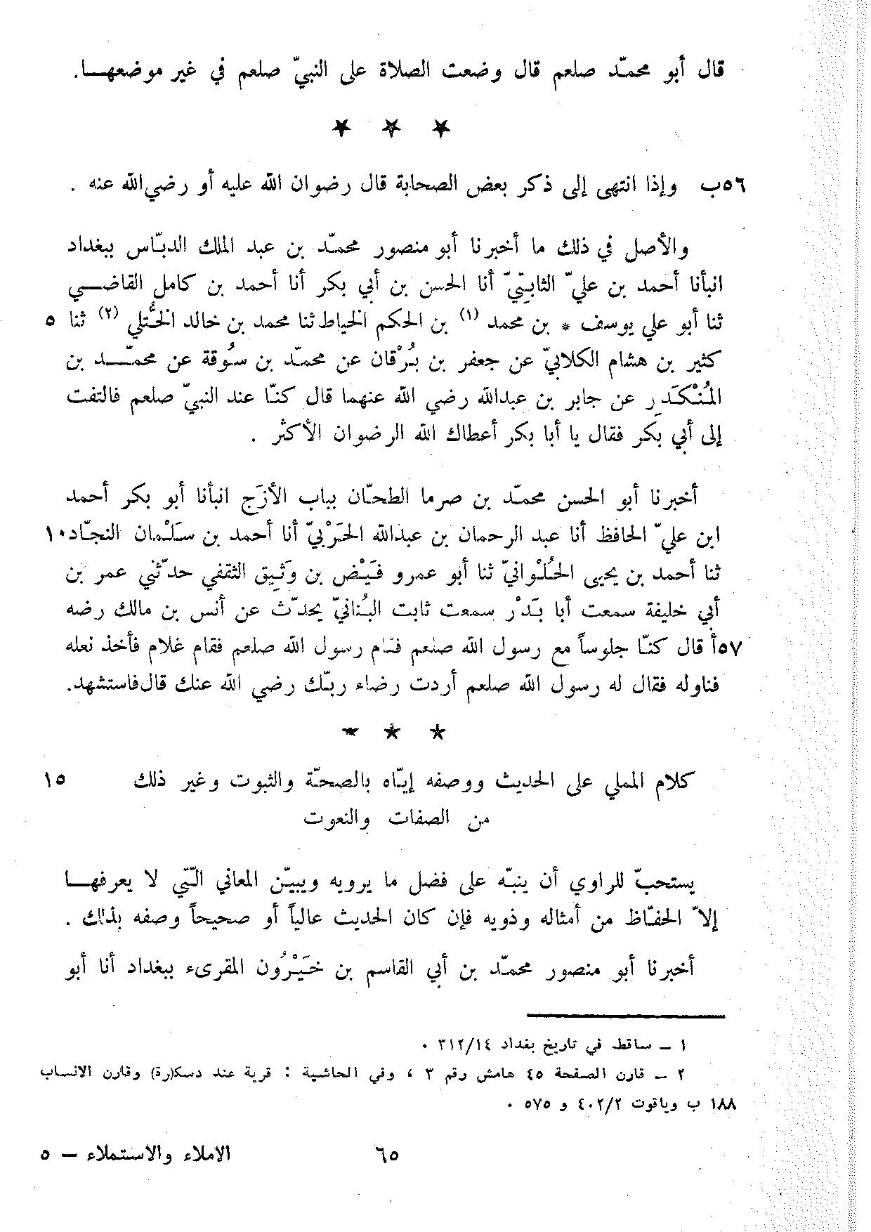 أَخْبَرَنَا أَبُو الْحَسَنِ مُحَمَّدُ بْنُ صَرْمَا الطَّحَّانُ بِبَابِ الأَزْجِ أَنْبَأَنَا أَبُو بَكْرٍ أَحْمَدُ بْنُ عَلِيٍّ الْحَافِظُ أَنا عَبْدُ الرَّحْمَنِ بْنُ عَبْدِ اللَّهِ الْحَرْبِيُّ أَنا أَحْمَدُ بْنُ سَلْمَانَ النَّجَّادُ ثَنَا أَحْمَدُ بْنُ يَحْيَى الْحُلْوَانِيُّ ثَنَا أَبُو عَمْرٍو فَيْضُ بْنُ وَثِيقٍ الثَّقَفِيُّ حَدَّثَنِي عُمَرُ بْنُ أَبِي خَلِيفَةَ سَمِعْتُ أَبَا بَدْرٍ سَمِعْتُ ثَابِتَ الْبُنَانِيَّ يُحَدِّثُ عَنْ أَنَسِ بن مَالك رضه قَالَ كُنَّا جُلُوسًا مَعَ رَسُولِ اللَّهِ صَلَّى اللَّهُ عَلَيْهِ وَسَلَّمَ فَقَامَ رَسُولُ اللَّهِ صَلَّى اللَّهُ عَلَيْهِ وَسَلَّمَ فَقَامَ غُلامٌ فَأَخَذَ نَعْلَهُ فَنَاوَلَهُ فَقَالَ لَهُ رَسُولُ اللَّهِ صَلَّى اللَّهُ عَلَيْهِ وَسَلَّمَ أَرَدْتَ رِضَاءَ رَبِّكَ رَضِيَ اللَّهُ عَنْكَ قَالَ فَاسْتُشْهِدَ كَلامُ الْمُمَلِّي عَلَى الْحَدِيثِ وَوَصْفُهُ إِيَّاهُ بِالصِّحَّةِ وَالثُّبُوتِ وَغَيْرُ ذَلِكَ مِنَ الصِّفَاتِ وَالنُّعُوتِ يُسْتَحَبُّ لِلرَّاوِي أَنْ يُنَبِّهَ عَلَى فَضْلِ مَا يَرْوِيهِ وَيُبَيِّنَ الْمَعَانِي الَّتِي لَا يَعْرِفُهَا إِلا الْحُفَّاظُ مِنْ أَمْثَالِهِ وَذَوِيهِ فَإِنْ كَانَ الْحَدِيثُ عَالِيًا أَوْ صَحِيحًا وَصَفَهُ بِذَلِكَ