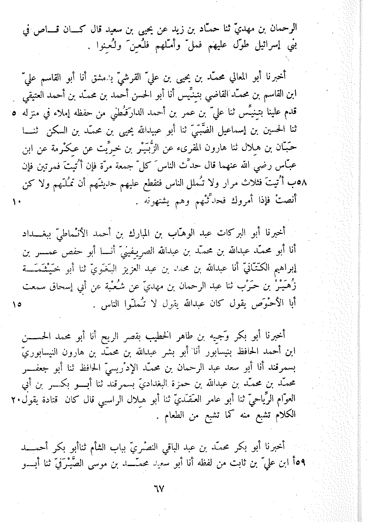 أَخْبَرَنَا أَبُو الْبَرَكَاتِ عَبْدُ الْوَهَّابِ بْنُ الْمُبَارَكِ بْنِ أَحْمَدَ الأَنْمَاطِيُّ بِبَغْدَادَ أَنا أَبُو مُحَمَّدٍ عَبْدُ اللَّهِ بْنُ مُحَمَّدِ بْنِ عَبْدِ اللَّهِ الصُّرَيْفِينِيُّ أَنا أَبُو حَفْصٍ عُمَرُ بْنُ إِبْرَاهِيمَ الْكَتَّانِيُّ أَنا عَبْدُ اللَّهِ بْنُ مُحَمَّدِ بْنِ عَبْدِ الْعَزِيزِ الْبَغَوِيُّ ثَنَا أَبُو خَيْثَمَةَ زُهَيْرُ بْنُ حَرْبٍ ثَنَا عَبْدُ الرَّحْمَنِ بْنُ مَهْدِيٍّ عَنْ شُعْبَةَ عَنْ أَبِي إِسْحَاقَ سَمِعْتُ أَبَا الأَحْوَصِ يَقُولُ كَانَ عَبْدُ اللَّهِ يَقُولُ لَا تَمَلُّوا النَّاسَ