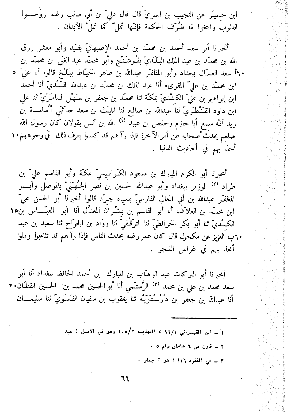 أَخْبَرَنَا أَبُو الْكَرَمِ الْمُبَارَكُ بْنُ مَسْعُودٍ الْكَرَابِيسِيُّ بِمَكَّةَ وَأَبُو الْقَاسِمِ عَلِيُّ بْنُ طَرَّادٍ الْوَزِيرُ بِبَغْدَادَ وَأَبُو عَبْدِ اللَّهِ الْحُسَيْنُ بْنُ نَصْرٍ الْجُهَنِيُّ بِالْمُوصِلِ وَأَبُو الْمُظَفَّرِ عَبْدُ اللَّهِ بْنُ أَبِي الْمَعَالِي الْفَارِسِيُّ بِسِيَاهَ جَرْدَ قَالُوا أَخْبَرَنَا أَبُو الْحَسَنِ عَلِيُّ بْنُ مُحَمَّدِ بْنِ الْعَلافِ أَنا أَبُو الْقَاسِمِ بْنُ بِشْرَانَ الْمُعَدَّلُ أَنا أَبُو الْعَبَّاسِ بْنُ الْكِنْدِيِّ ثَنَا أَبُو بَكْرٍ الْخَرَائِطِيُّ ثَنَا التَّرْقُفِيُّ ثَنَا رَوَّادُ بْنُ الْجَرَّاحِ ثَنَا سَعِيدُ بْنُ عَبْدِ الْعَزِيزِ عَنْ مَكْحُولٍ قَالَ كَانَ عمر رضه يُحَدِّثُ النَّاسَ فَإِذَا رَآهُمْ قَدْ تَثَاءَبُوا وَمَلُّوا أَخَذَ بِهِمْ فِي غَرَاسِ الشَّجَرِ