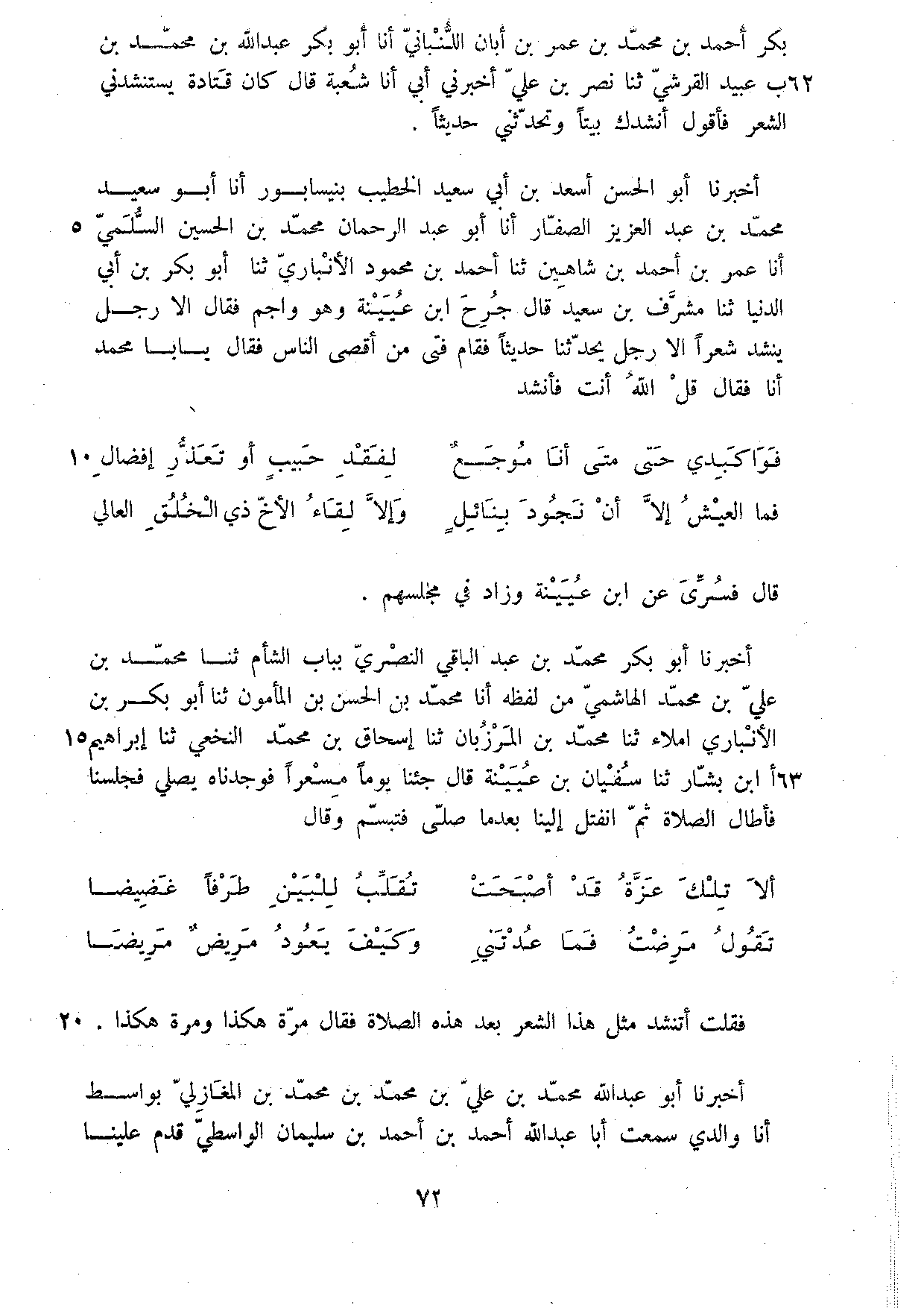 أَخْبَرَنَا أَبُو بَكْرٍ مُحَمَّدُ بْنُ عَبْدِ الْبَاقِي النَّصْرِيُّ بِبَابِ الشَّامِ ثَنَا مُحَمَّدُ بْنُ عَلِيِّ بْنِ مُحَمَّدٍ الْهَاشِمِيُّ مِنْ لَفْظِهِ أَنا مُحَمَّدُ بْنُ الْحَسَنِ بْنِ الْمَأْمُونِ ثَنَا أَبُو بَكْرِ بْنُ الأَنْبَارِيِّ إِمْلاءً ثَنَا مُحَمَّدُ بْنُ الْمَرْزُبَانِ ثَنَا إِسْحَاقُ بْنُ مُحَمَّدٍ النَّخْعِيُّ ثَنَا إِبْرَاهِيمُ بْنُ بَشَّارٍ ثَنَا سُفْيَانُ بْنُ عُيَيْنَةَ قَالَ جِئْنَا يَوْمًا مِسْعَرًا فَوَجَدْنَاهُ فَجَلَسْنَا فَأَطَالَ الصَّلاةَ ثُمَّ انْفَتَلَ إِلَيْنَا بَعْدَمَا صَلَّى فَتَبَسَّمَ وقَالَ