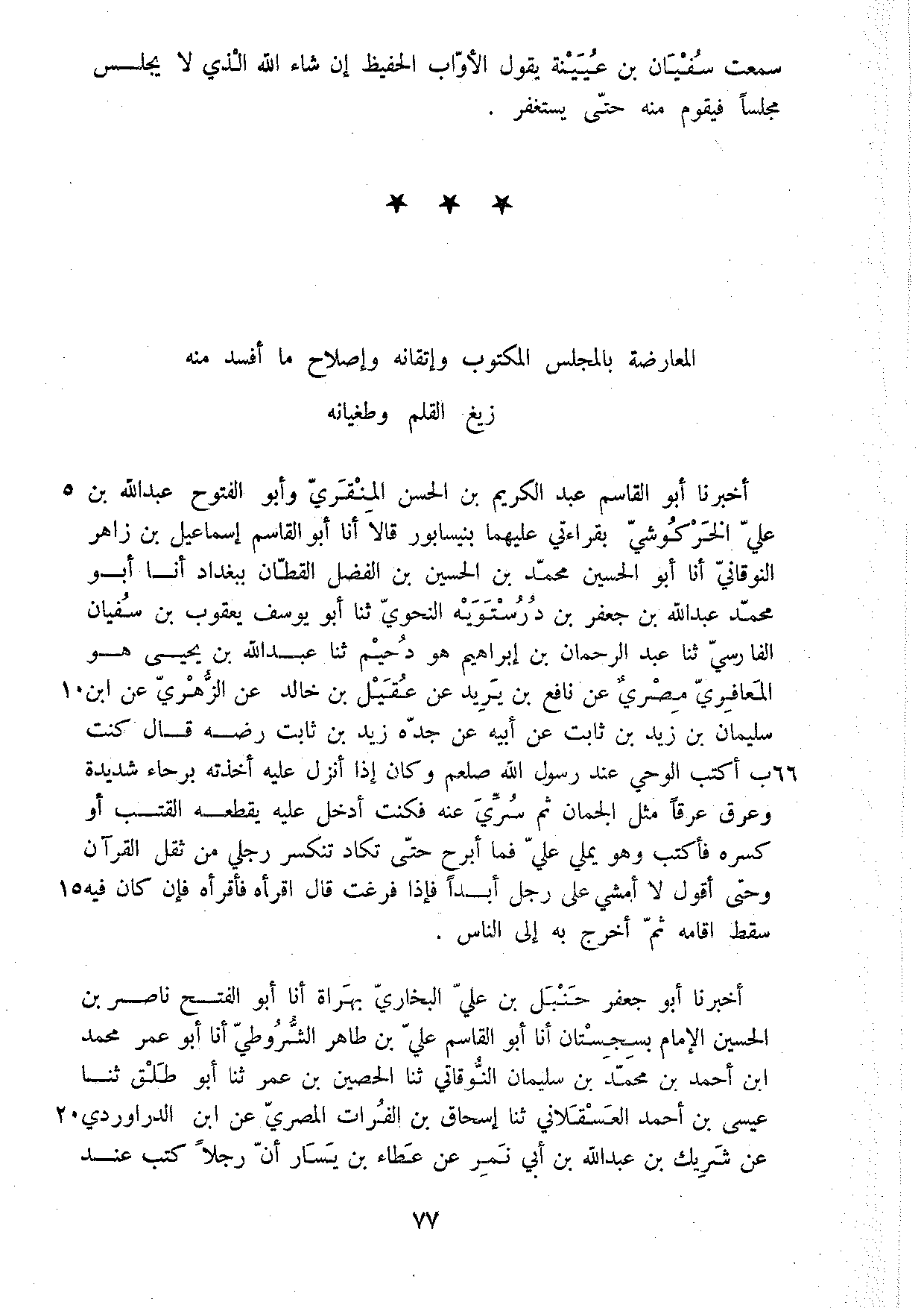 أَخْبَرَنَا أَبُو جَعْفَرٍ حَنْبَلُ بْنُ عَلِيٍّ الْبُخَارِيُّ بِهَرَاةَ أَنا أَبُو الْفَتْحِ نَاصِرُ بْنُ الْحُسَيْنِ الإِمَامُ بِسِجِسْتَانَ أَنا أَبُو الْقَاسِمِ عَلِيُّ بْنُ طَاهِرٍ الشُّرُوطِيُّ أناأبو عُمَرَ مُحَمَّدُ بْنُ أَحْمَدَ بْنِ مُحَمَّدِ بْنِ سُلَيْمَانَ النُّوقَاتِيُّ ثَنَا الْحُصَيْنُ بْنُ عُمَرَ ثَنَا أَبُو طَلْقٍ ثَنَا عِيسَى بْنُ أَحْمَدَ الْعَسْقَلانِيُّ ثَنَا إِسْحَاقُ بْنُ الْفُرَاتِ الْمصْرِيّ عَن بن الدَّرَاوَرْدِيُّ عَنْ شَرِيكِ بْنِ عَبْدِ اللَّهِ بْنِ أَبِي نَمِرٍ عَنْ عَطَاءِ بْنِ يَسَارٍ أَنَّ رَجُلا كَتَبَ عِنْدَ النَّبِيِّ صَلَّى اللَّهُ عَلَيْهِ وَسَلَّمَ فَقَالَ لَهُ النَّبِيُّ صَلَّى اللَّهُ عَلَيْهِ وَسَلَّمَ كَتَبْتُ قَالَ نَعَمْ قَالَ عَرَضْتُهُ قَالَ لَا قَالَ لَمْ يَكْتُبْهُ حَتَّى تَعْرِضَهُ فَيَصِحَّ