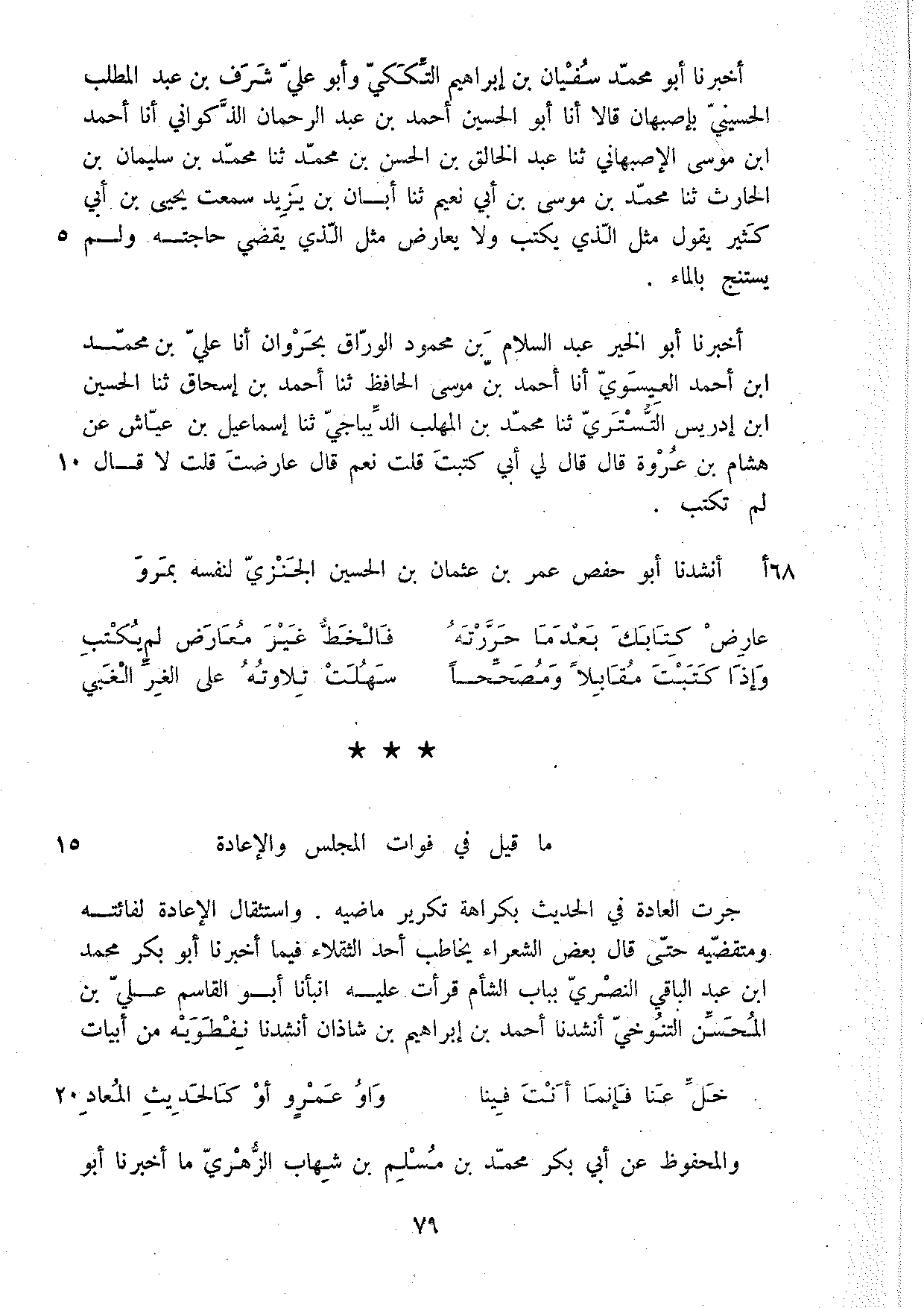 أَخْبَرَنَا أَبُو بَكْرٍ مُحَمَّدُ بْنُ عَبْدِ الْبَاقِي النَّصْرِيُّ بِبَابِ الشَّامِ قَرَأْتُ عَلَيْهِ أَنْبَأَنَا أَبُو الْقَاسِمِ عَلِيُّ بْنُ الْمُحَسِّنِ التَّنُوخِيُّ أَنْشَدَنَا أَحْمَدُ بْنُ إِبْرَاهِيمَ بْنِ شَاذَانَ أَنْشَدَنَا نَفْطَوَيْهِ مِنْ أَبْيَاتٍ