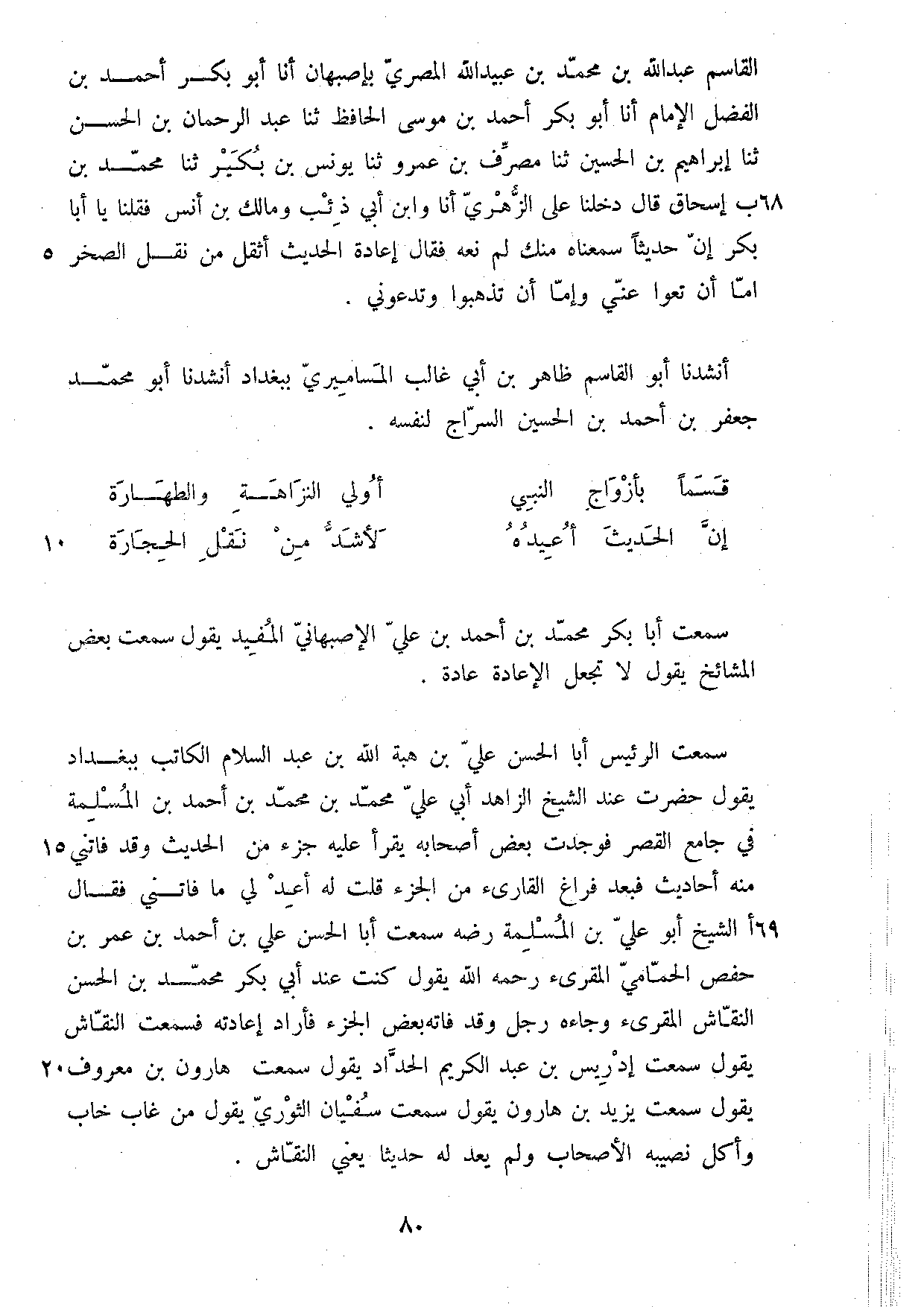سَمِعْتُ الرَّئِيسَ أَبَا الْحَسَنِ عَلِيَّ بْنَ هِبَةَ اللَّهِ بْنِ عَبْدِ السَّلامِ الْكَاتِبَ بِبَغْدَادَ يَقُولُ حَضَرْتُ عِنْدَ الشَّيْخِ الزَّاهِدِ أَبِي عَلِيٍّ مُحَمَّدُ بْنُ مُحَمَّدِ بْنِ أَحْمَدَ بْنِ الْمُسْلِمَةِ فِي جَامِعِ الْقَصْرِ فَوَجَدْتُ بَعْضَ أَصْحَابِهِ يَقْرَأُ عَلَيْهِ جُزْءً مِنَ الْحَدِيثِ وَقَدْ فَاتَنِي مِنْهُ أَحَادِيثُ فَبَعْدَ فَرَاغِ القارىء مِنَ الْجُزْءِ قُلْتُ لَهُ أَعِدْ لِي مَا فَاتَنِي فَقَالَ الشَّيْخُ أَبُو عَليّ بن الْمسلمَة رضه سَمِعْتُ أَبَا الْحَسَنِ عَلِيَّ بْنَ أَحْمَدَ بْنِ عُمَرَ بْنِ حَفْصٍ الحمامي المقرىء رَحِمَهُ اللَّهُ يَقُولُ كُنْتُ عِنْدَ أَبِي بَكْرٍ مُحَمَّدِ بْنِ الْحَسَنِ النقاش المقرىء وَجَاءَهُ رَجُلٌ وَقَدْ فَاتَهُ بَعْضُ الْجُزْءِ فَأَرَادَ إِعَادَتَهُ فَسَمِعْتُ النَّقَّاشَ يَقُولُ سَمِعْتُ إِدْرِيسَ بْنَ عَبْدِ الْكَرِيمِ الْحَدَّادَ يَقُولُ سَمِعْتُ هَارُونَ بْنَ مَعْرُوفٍ يَقُولُ سَمِعْتُ زَيْدَ بْنَ هَارُونَ يَقُولُ سَمِعْتُ سُفْيَانَ الثَّوْرِيَّ يَقُولُ مَنْ غَابَ خَابَ وَأَكَلَ نَصِيبَهُ الأَصْحَابُ وَلَمْ يَعُدْ لَهُ حَدِيثًا يَعْنِي النَّقَّاشَ