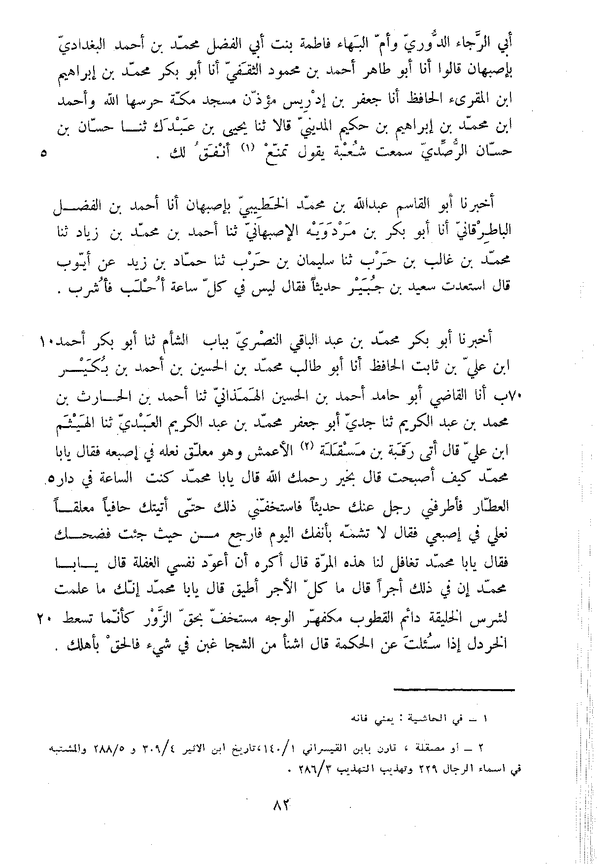 أَخْبَرَنَا أَبُو الْقَاسِمِ عَبْدُ اللَّهِ بْنُ مُحَمَّدٍ الْخَطِيبِيُّ بِأَصْبَهَانَ أَنا أَحْمد بن الْفضل الْبَاطِرْقَانِيُّ أناأبو بَكْرِ بْنِ مَرْدَوَيْهِ الأَصْبَهَانِيُّ ثَنَا أَحْمَدُ بْنُ مُحَمَّدِ بْنِ زِيَادٍ ثَنَا مُحَمَّدُ بْنُ غَالِبِ بْنِ حَرْبٍ ثَنَا سُلَيْمَانُ بْنُ حَرْبٍ ثَنَا حَمَّادُ بْنُ زَيْدٍ عَنْ أَيُّوبَ قَالَ اسْتَعَدْتُ سَعِيدَ بْنَ جُبَيْرٍ حَدِيثًا فَقَالَ لَيْسَ فِي كُلِّ سَاعَةٍ أُحْلَبُ فَأُشْرِبُ