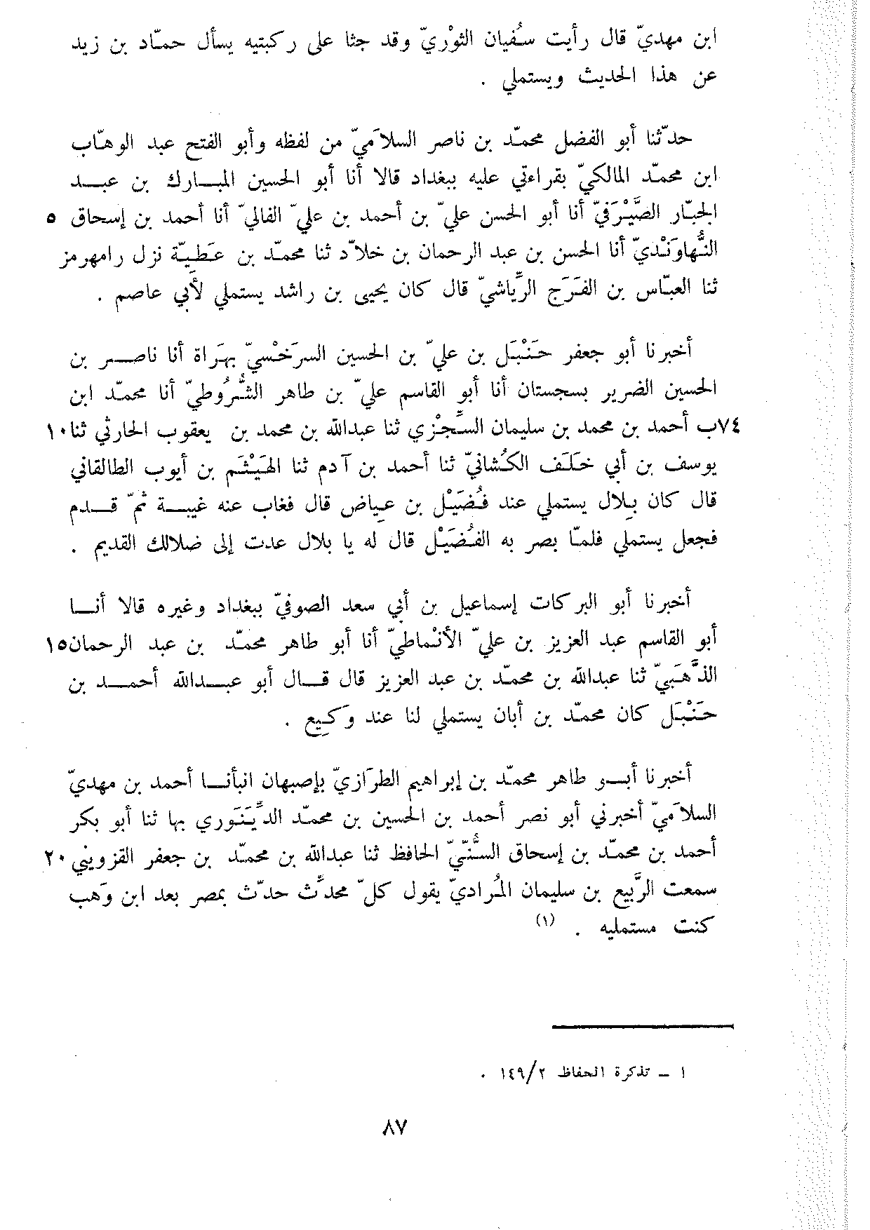 أَخْبَرَنَا أَبُو الْبَرَكَاتِ إِسْمَاعِيلُ بْنُ أَبِي سَعْدٍ الصُّوفِيُّ بِبَغْدَادَ وَغَيْرُهُ قَالَا أَنا أَبُو الْقَاسِمِ عَبْدُ الْعَزِيزِ بْنُ عَلِيٍّ الأَنْمَاطِيُّ أَنا أَبُو طَاهِرٍ مُحَمَّدُ بْنُ عَبْدِ الرَّحْمَنِ الذَّهَبِيُّ ثَنَا عَبْدُ اللَّهِ بْنُ مُحَمَّدِ بْنِ عَبْدِ الْعَزِيزِ قَالَ قَالَ أَبُو عَبْدِ اللَّهِ أَحْمَدَ بْنِ حَنْبَلٍ كَانَ مُحَمَّدُ بْنُ أَبَانٍ يَسْتَمْلِي لَنَا عِنْدَ وَكِيعٍ