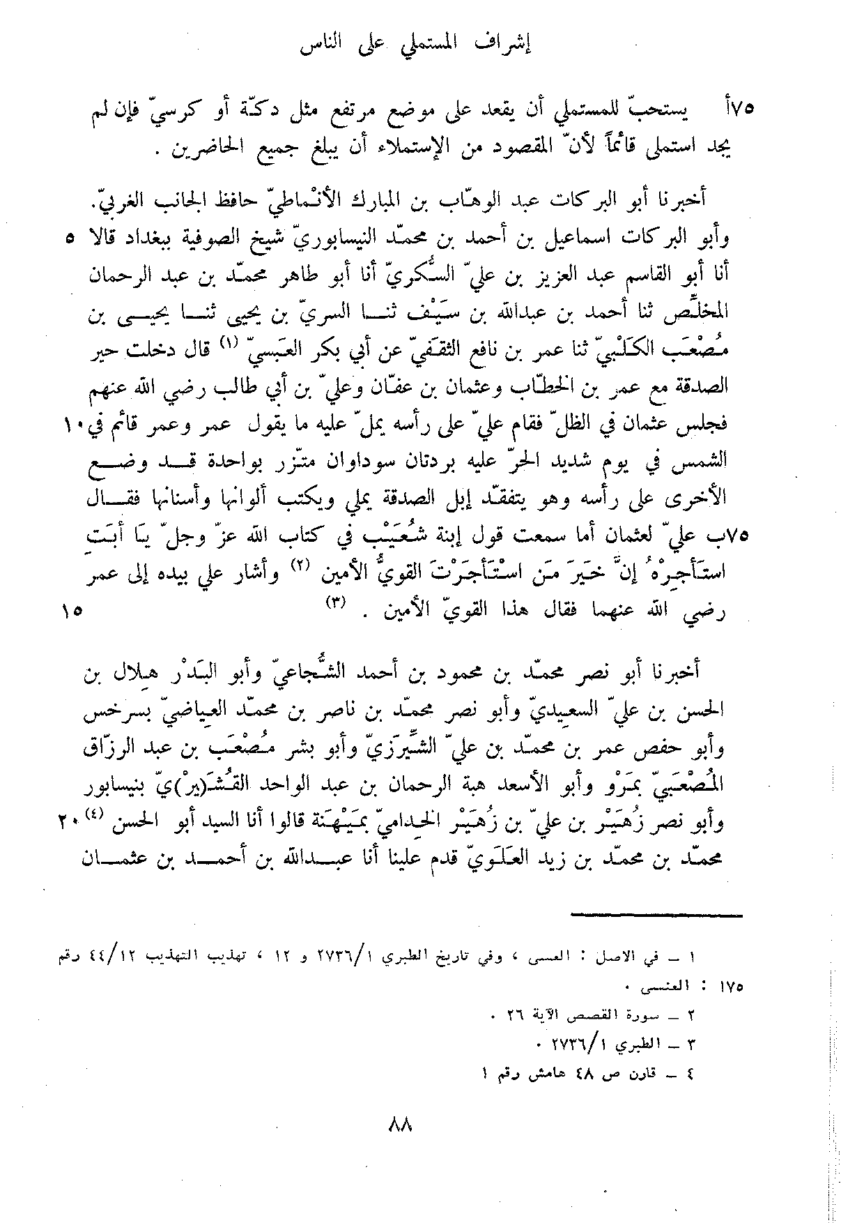 أَخْبَرَنَا أَبُو الْبَرَكَاتِ عَبْدُ الْوَهَّابِ بْنُ الْمُبَارَكِ الأَنْمَاطِيُّ حَافِظُ الْجَانِبِ الْغَرْبِي وَأَبُو الْبَرَكَاتِ إِسْمَاعِيلُ بْنُ أَحْمَدَ بْنِ مُحَمَّدٍ النَّيْسَابُورِيُّ شَيْخُ الصُّوفِيَّةِ بِبَغْدَادَ قَالَا أَنا أَبُو الْقَاسِمِ عَبْدُ الْعَزِيزِ بْنُ عَلِيٍّ السُّكَّرِيُّ أَنا أَبُو طَاهِرٍ مُحَمَّدُ بْنُ عَبْدِ الرَّحْمَنِ الْمُخَلِّصُ ثَنَا أَحْمَدُ بْنُ عَبْدِ اللَّهِ بْنِ سَيْفٍ ثَنَا السَّرِيُّ بْنُ يَحْيَى ثَنَا يَحْيَى بْنُ مُصْعَبٍ الْكَلْبِيُّ ثَنَا عُمَرُ بْنُ نَافِعٍ الثَّقَفِيُّ عَنْ أَبِي بَكْرٍ الْعَبْسِيِّ قَالَ دَخَلْتُ حَيْرَ الصَّدَقَةِ مَعَ عُمَرَ بْنَ الْخَطَّابِ وَعُثْمَانَ بْنِ عَفَّانَ وَعَلِيِّ بْنُ أَبِي طَالِبٍ رَضِيَ اللَّهُ عَنْهُمْ فَجَلَسَ عُثْمَانُ فِي الظِّلِّ فَقَامَ عَلِيٌّ عَلَى رَأْسِهِ يُمَلِّ عَلَيْهِ مَا يَقُولُ عُمَرُ وَعُمَرُ قَائِمٌ فِي الشَّمْسِ فِي يَوْمٍ شَدِيدِ الْحَرِّ عَلَيْهِ بُرْدَتَانِ سَوْدَاوَانِ مُتَّزِرٌ بِوَاحِدَةٍ قَدْ وَضَعَ الأُخْرَى عَلَى رَأْسِهِ وَهُوَ يَتَفَقَّدُ إِبِلَ الصَّدَقَةِ يُمَلِّي وَيَكْتُبُ أَلْوَانَهَا وَأَسْنَانَهَا فَقَالَ عَلِيٌّ لِعُثْمَانَ أَمَا سَمِعْتَ قَوْلَ ابْنَةَ شُعَيْبٍ فِي كِتَابِ اللَّهِ عَزَّ وَجَلَّ يَا أَبَتِ اسْتَأْجِرْهُ إِنَّ خَيْرَ مَنِ اسْتَأْجَرْتَ الْقوي الْأمين وَأَشَارَ عَلِيٌّ بِيَدِهِ إِلَى عُمَرَ رَضِيَ اللَّهُ عَنْهُمَا فَقَالَ هَذَا الْقَوِيُّ الأَمِينُ