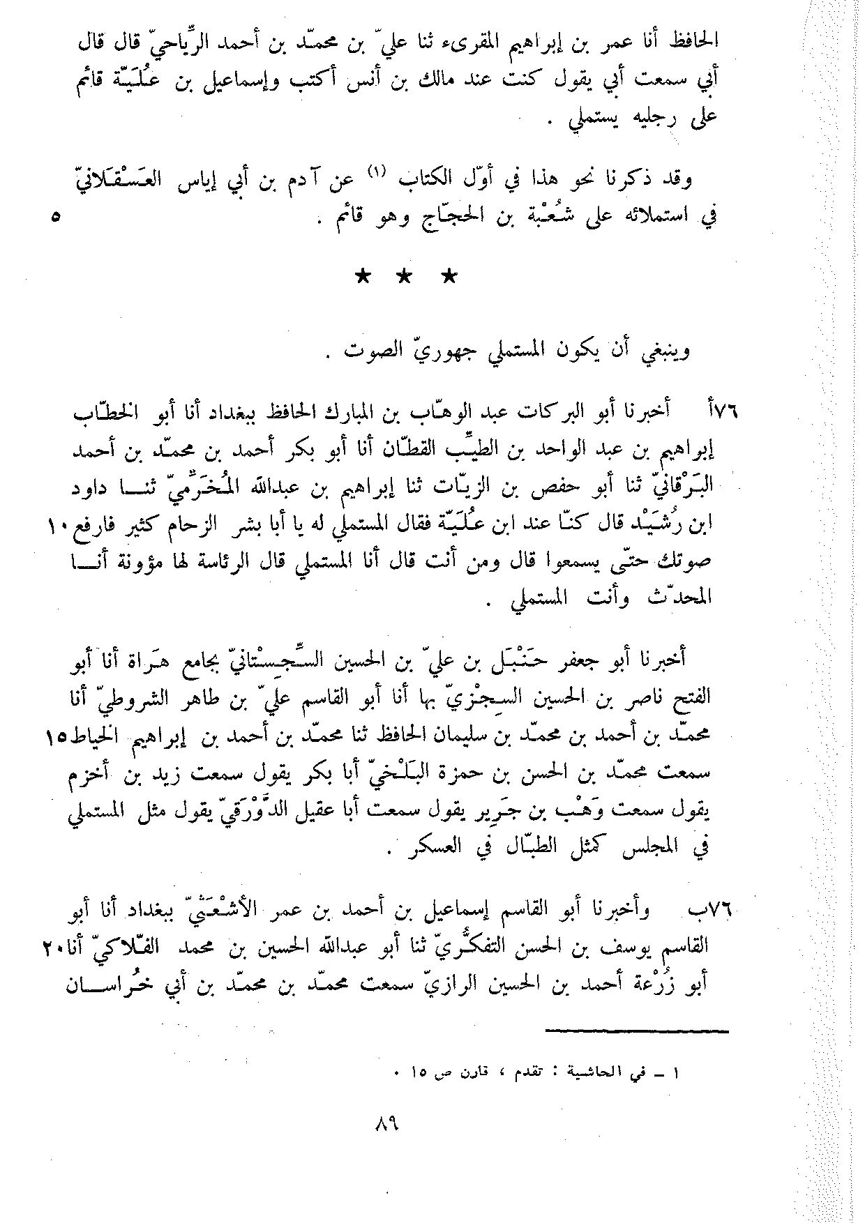 أَخْبَرَنَا أَبُو الْبَرَكَاتِ عَبْدُ الْوَهَّابِ بْنُ الْمُبَارَكِ بِبَغْدَادَ أَنا أَبُو الْخَطَّابِ إِبْرَاهِيمُ بْنُ عَبْدِ الْوَاحِدِ بْنِ الطَّيِّبِ الْقَطَّانُ أَنا أَبُو بَكْرٍ أَحْمَدُ بْنُ مُحَمَّدِ بْنِ أَحْمَدَ الْبَرْقَانِيُّ ثَنَا أَبُو حَفْصِ بْنُ الزَّيَّاتِ ثَنَا إِبْرَاهِيمُ بْنُ عَبْدِ اللَّهِ الْمَخْرَمِيُّ ثَنَا دَاوُدُ بْنُ رَشِيدٍ قَالَ كُنَّا عِنْد بن عُلَيَّةَ فَقَالَ الْمُسْتَمْلِي لَهُ يَا أَبَا بِشْرٍ الزِّحَامُ كَثِيرٌ فَارْفَعْ صَوْتَكَ حَتَّى يَسْمَعُوا قَالَ وَمَنْ أَنْتَ قَالَ أَنَا الْمُسْتَمْلِي قَالَ الرِّئَاسَة لَهَا مؤونة أَنَا الْمُحَدِّثُ وَأَنْتَ الْمُسْتَمْلِي