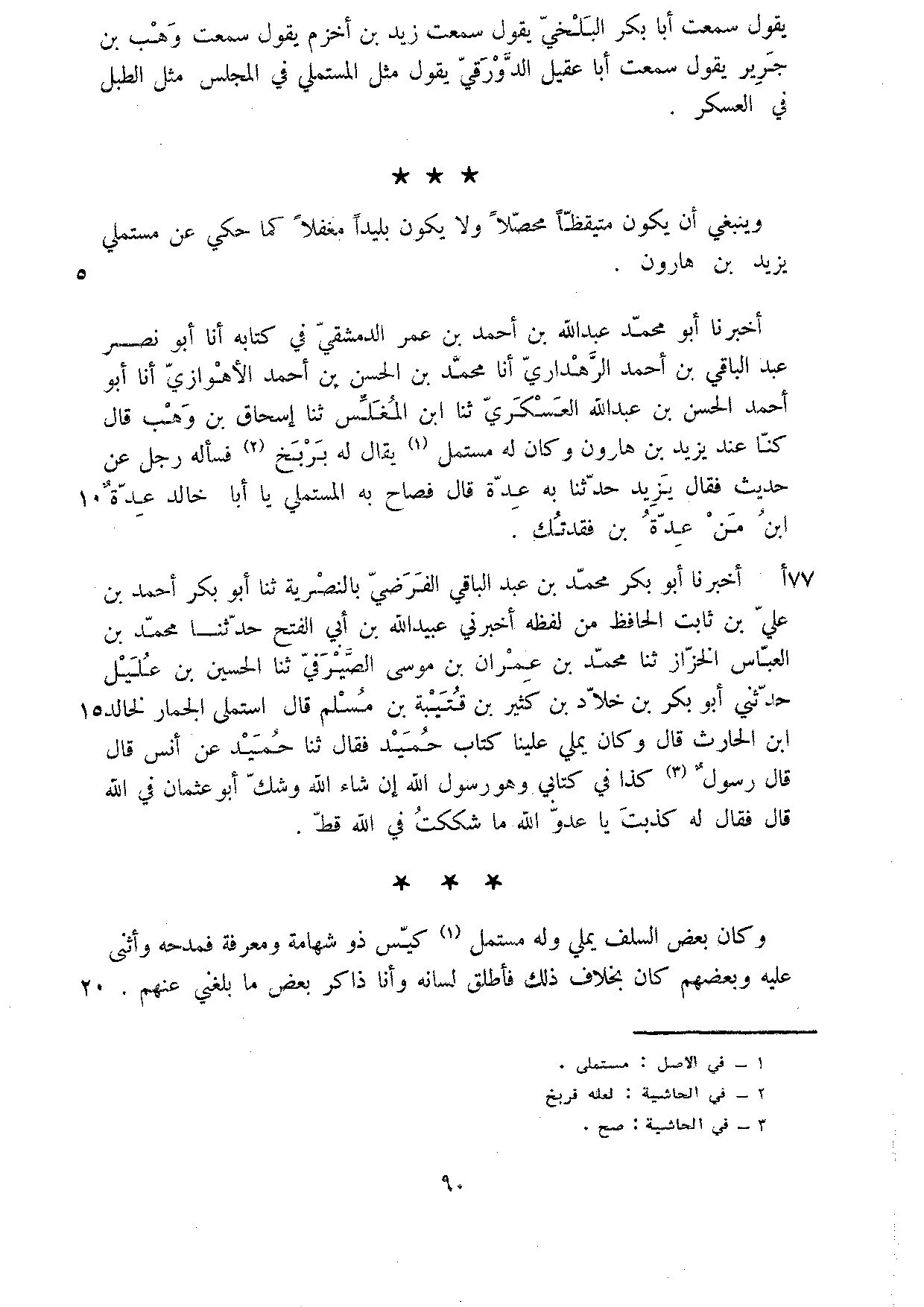 أَخْبَرَنَا أَبُو بَكْرٍ مُحَمَّدُ بْنُ عَبْدِ الْبَاقِي الْفَرَضِيُّ بِالنَّصْرِيَّةِ ثَنَا أَبُو بَكْرٍ أَحْمَدُ بْنُ عَلِيِّ بْنِ ثَابِتٍ الْحَافِظُ مِنْ لَفْظِهِ أَخْبَرَنِي عُبَيْدُ اللَّهِ بْنُ أَبِي الْفَتْحِ حَدَّثَنَا مُحَمَّدُ بْنُ الْعَبَّاسِ الْخَزَّازُ ثَنَا مُحَمَّدُ بْنُ عِمْرَانَ بْنِ مُوسَى الصَّيْرَفِيُّ ثَنَا الْحُسَيْنُ بْنُ عَلِيلٍ حَدَّثَنِي أَبُو بَكْرِ بْنُ خَلادِ بْنِ كَثِيرِ بْنِ قُتَيْبَةَ بْنِ مُسْلِمٍ قَالَ اسْتَمْلَى الْجُمَارُ لِخَالِدِ بْنِ الْحَارِثِ قَالَ وَكَانَ يُمَلِّي عَلَيْنَا كِتَابَ حُمَيْدٍ فَقَالَ ثَنَا حُمَيْدٌ عَنْ أَنَسٍ قَالَ قَالَ رَسُولُ كَذَا فِي كِتَابِي وَهُوَ رَسُولُ اللَّهِ إِنْ شَاءَ اللَّهُ وَشَكَّ أَبُو عُثْمَانَ فِي اللَّهِ قَالَ فَقَالَ لَهُ كَذَبْتَ يَا عَدُوَّ اللَّهِ مَا شَكَكْتُ فِي اللَّهِ قَطْ وَكَانَ بَعْضُ السَّلَفِ يُمَلِّي وَلَهُ مُسْتَمْلِي كَيِّسٌ ذُو شَهَامَةٍ وَمَعْرِفَةٍ فَمَدَحَهُ وَأَثْنَى عَلَيْهِ وَبَعْضُهُمْ كَانَ بِخِلافِ ذَلِكَ فَأَطْلَقَ لِسَانَهُ وَأَنَا ذَاكِرٌ بَعْضَ مَا بَلَغَنِي عَنْهُمْ