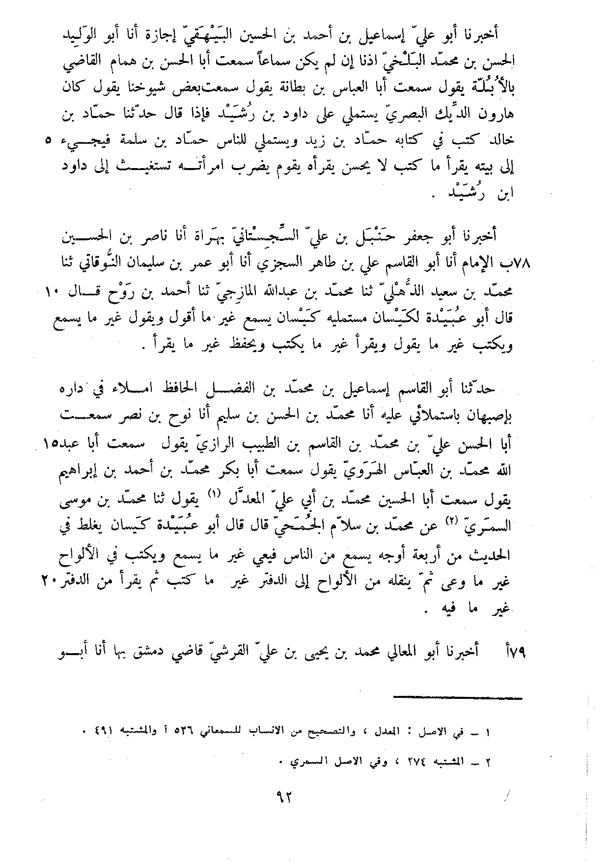 حَدَّثَنَا أَبُو الْقَاسِمِ إِسْمَاعِيلُ بْنُ مُحَمَّدِ بْنِ الْفَضْلِ الْحَافِظُ إِمْلاءً فِي دَارِهِ بِأَصْبَهَانَ بِاسْتِمْلائِي عَلَيْهِ أَنا مُحَمَّدُ بْنُ الْحَسَنِ بْنِ سُلَيْمٍ أَنا نُوحُ بْنُ نَصْرٍ سَمِعْتُ أَبَا الْحَسَنِ عَلِيُّ بْنُ مُحَمَّدِ بْنِ الْقَاسِمِ بْنِ الطَّيِّبِ الرَّازِيُّ يَقُولُ سَمِعْتُ أَبَا عَبْدِ اللَّهِ مُحَمَّدَ بْنَ الْعَبَّاسِ الْهَرَوِيَّ يَقُولُ سَمِعْتُ أَبَا بَكْرٍ مُحَمَّدِ بْنِ أَحْمَدَ بْنِ إِبْرَاهِيمَ يَقُولُ سَمِعْتُ أَبَا الْحُسَيْنِ مُحَمَّدَ بْنَ أَبِي عَلِيٍّ الْمُعَدَّلَ يَقُولُ ثَنَا مُحَمَّدُ بْنُ مُوسَى السَّمُرِيُّ عَنْ مُحَمَّدِ بْنِ سَلامٍ الْجُمَحِيِّ قَالَ قَالَ أَبُو عُبَيْدَةَ وَيَكْتُبُ فِي الأَلْوَاحِ غَيْرَ مَا وَعَى ثُمَّ يَنْقُلُهُ مِنَ الأَلْوَاحِ إِلَى الدَّفْتَرِ غَيْرَ مَا كَتَبَ ثُمَّ يَقْرَأُ مِنَ الدَّفْتَرِ غَيْرَ مَا فِيهِ