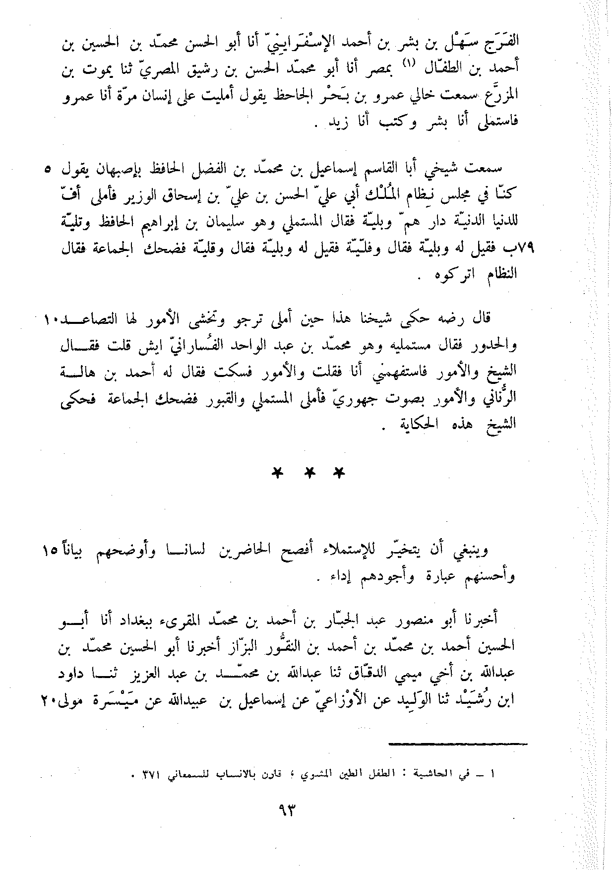 سَمِعْتُ شَيْخِي أَبَا الْقَاسِمِ إِسْمَاعِيلَ بْنُ مُحَمَّدِ بْنِ الْفَضْلِ الْحَافِظُ بِأَصْبَهَانَ يَقُولُ كُنَّا فِي مَجْلِسِ نِظَامِ الْمَلِكِ أَبِي عَلِيٍّ الْحَسَنِ بْنِ عَلِيِّ بْنِ إِسْحَاقَ الْوَزِيرِ فَأَمْلَى أُفٍّ لِلدُّنْيَا الدَّنِيَّةِ دَارِ هَمٍّ وَبَلِيَّةٍ فَقَالَ الْمُسْتَمْلِي وَهُوَ سُلَيْمَانُ بْنُ إِبْرَاهِيمَ الْحَافِظُ وَتَلِيَّةٍ فَقِيلَ لَهُ وَبَلِيَّةٍ فَقَالَ وَفَلِيَّةٍ فَقِيلَ لَهُ وَبَلِيَّةٍ فَقَالَ وَقَلِيَّةٍ فَضَحِكَ الْجَمَاعَةُ فَقَالَ النِّظَامُ اتْرُكُوهُ قَالَ رضه حَكَى شَيْخُنَا هَذَا حِينَ أَمْلَى تَرْجُو وَتَخْشَى الأُمُورَ لَهَا التَّصَاعُدُ وَالْحُدُورُ فَقَالَ مُسْتَمْلِيهِ وَهُوَ مُحَمَّدُ بْنُ عَبْدِ الْوَاحِدِ الْفَسَارَانِيُّ أَيْشِ قُلْتَ فَقَالَ الشَّيْخُ وَالأُمُورُ فَاسْتَفْهِمْنِي أَنَا فَقُلْتُ وَالأُمُورُ فَسَكَتَ فَقَالَ لَهُ أَحْمَدُ بْنُ هَالَةَ الرَّنَّانِيُّ وَالأُمُورُ بِصَوْتٍ جَهْوَرِيٍّ فَأَمْلَى الْمُسْتَمْلِي وَالْقُبُورُ فَضَحِكَ الْجَمَاعَةُ فَحَكَى الشَّيْخُ هَذِهِ الْحِكَايَةَ وَيَنْبَغِي أَنْ يَتَخَيَّرَ لِلاسْتِمْلاءِ أَفْصَحَ الْحَاضِرِينَ لِسَانًا وَأَوْضَحَهُمْ بَيَانًا وَأَحْسَنَهُمْ عِبَارَةً وَأَجْوَدَهُمْ أَدَاءً