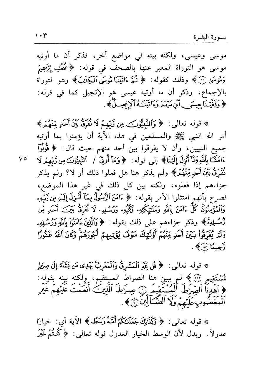 • قوله تعالى: {قُلْ لِلَّهِ الْمَشْرِقُ وَالْمَغْرِبُ يَهْدِي مَنْ يَشَاءُ إِلَى صِرَاطٍ مُسْتَقِيمٍ (١٤٢)} لم يبين هنا الصراط المستقيم، ولكنه بينه بقوله: {اهْدِنَا الصِّرَاطَ الْمُسْتَقِيمَ (٦) صِرَاطَ الَّذِينَ أَنْعَمْتَ عَلَيْهِمْ غَيْرِ الْمَغْضُوبِ عَلَيْهِمْ وَلا الضَّالِّينَ (٧)}.