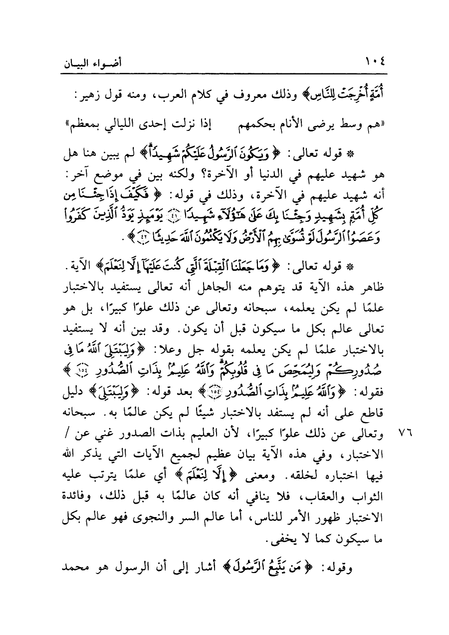 • قوله تعالى: {وَمَا جَعَلْنَا الْقِبْلَةَ الَّتِي كُنْتَ عَلَيْهَا إِلَّا لِنَعْلَمَ} الآية. ظاهر هذه الآية قد يتوهم منه الجاهل أنه تعالى يستفيد بالاختبار علما لم يكن يعلمه، سبحانه وتعالى عن ذلك علوا كبيرا، بل هو تعالى عالم بكل ما سيكون قبل أن يكون. وقد بين أنه لا يستفيد بالاختبار علما لم يكن يعلمه بقوله جل وعلا: {لِيَبْتَلِيَ اللَّهُ مَا فِي صُدُورِكُمْ وَلِيُمَحِّصَ مَا فِي قُلُوبِكُمْ وَاللَّهُ عَلِيمٌ بِذَاتِ الصُّدُورِ (١٥٤)} فقوله: {وَاللَّهُ عَلِيمٌ بِذَاتِ الصُّدُورِ (١٥٤)} بعد قوله: {وَلِيَبْتَلِيَ} دليل قاطع على أنه لم يستفد بالاختبار شيئا لم يكن عالما به. سبحانه وتعالى عن ذلك علوا كبيرا، لأن العليم بذات الصدور غني عن الاختبار، وفي هذه الآية بيان عظيم لجميع الآيات التي يذكر الله فيها اختباره لخلقه. ومعنى {إِلَّا لِنَعْلَمَ} أي علما يترتب عليه الثواب والعقاب، فلا ينافي أنه كان عالما به قبل ذلك، وفائدة الاختبار ظهور الأمر للناس، أما عالم السر والنجوى فهو عالم بكل ما سيكون كما لا يخفى.