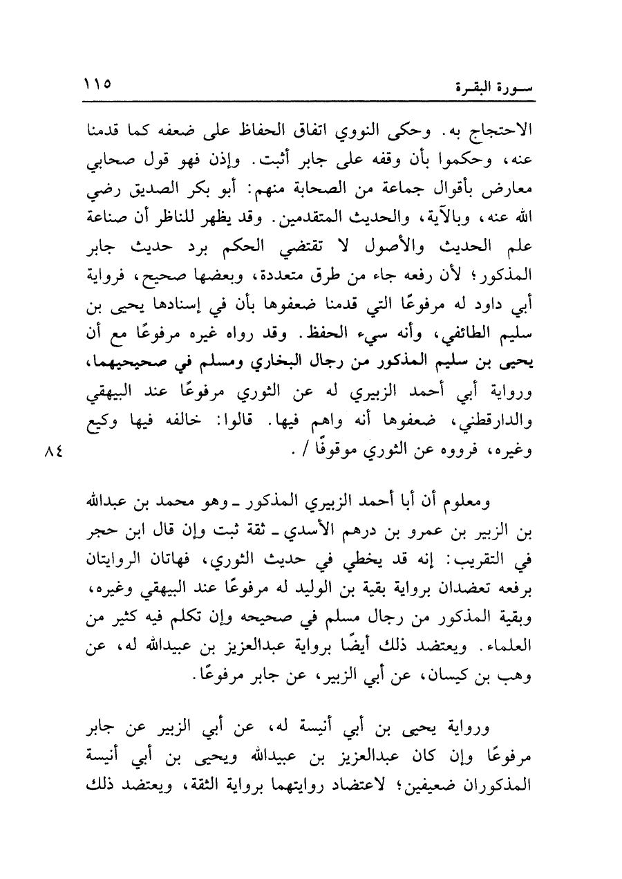 ومعلوم أن أبا أحمد الزبيري المذكور -وهو محمد بن عبد الله بن الزبير بن عمرو بن درهم الأسدي- ثقة ثبت وإن قال ابن حجر في التقريب: إنه قد يخطىء في حديث الثوري، فهاتان الروايتان برفعه تعضدان برواية بقية بن الوليد له مرفوعا عند البيهقي وغيره، وبقية المذكور من رجال مسلم في صحيحه وإن تكلم فيه كثير من العلماء. ويعتضد ذلك أيضا برواية عبد العزيز بن عبيد الله له، عن وهب بن كيسان، عن أبي الزبير، عن جابر مرفوعا.