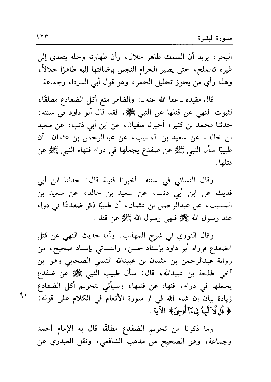 وقال النووي في شرح المهذب: وأما حديث النهي عن قتل الضفدع فرواه أبو داود بإسناد حسن، والنسائي بإسناد صحيح، من رواية عبد الرحمن بن عثمان بن عبيد الله التيمي الصحابي وهو ابن أخي طلحة بن عبيد الله، قال: سأل طبيب النبي - صلى الله عليه وسلم - عن ضفدع يجعلها في دواء، فنهاه عن قتلها، وسيأتي لتحريم أكل الضفادع زيادة بيان إن شاء الله في سورة الأنعام في الكلام على قوله: {قُلْ لا أَجِدُ فِي مَا أُوحِيَ} الآية.