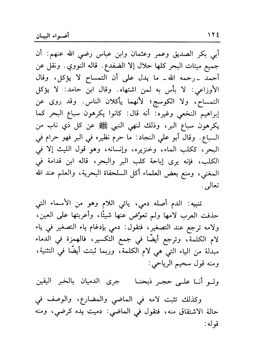 تنبيه: الدم أصله دمي، يائي اللام وهو من الأسماء التي حذفت العرب لامها ولم تعوض عنها شيئا، وأعربتها على العين، ولامه ترجع عند التصغير، فتقول: دمي بإدغام ياء التصغير في ياء لام الكلمة، وترجع أيضا في جمع التكسير، فالهمزة في الدماء مبدلة من الياء التي هي لام الكلمة، وربما ثبتت أيضا في التثنية، ومنه قول سحيم الرياحي: