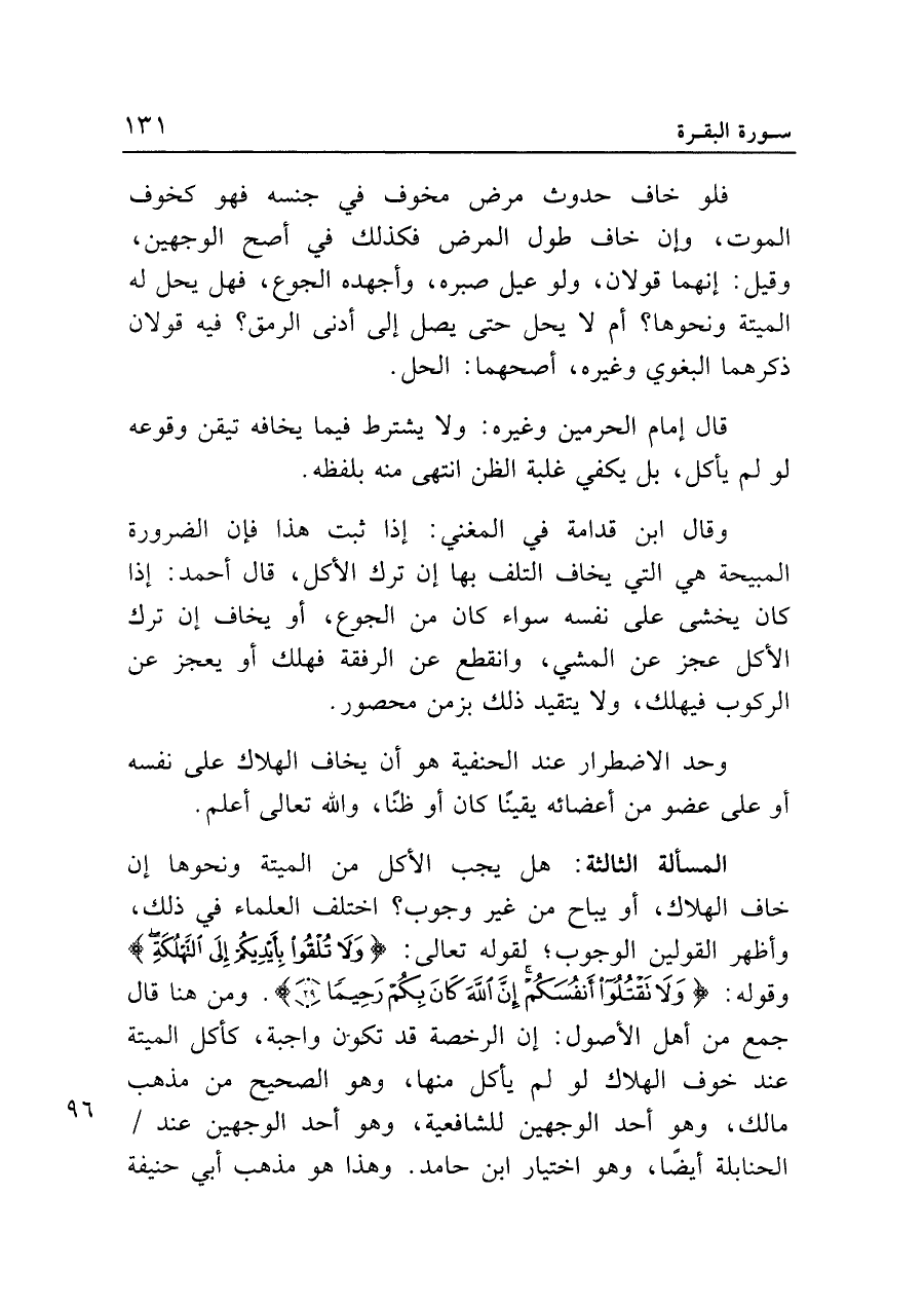 المسألة الثالثة: هل يجب الأكل من الميتة ونحوها إن خاف الهلاك، أو يباح من غير وجوب؟ اختلف العلماء في ذلك، وأظهر القولين الوجوب؛ لقوله تعالى: {وَلا تُلْقُوا بِأَيْدِيكُمْ إِلَى التَّهْلُكَةِ} وقوله: {وَلا تَقْتُلُوا أَنْفُسَكُمْ إِنَّ اللَّهَ كَانَ بِكُمْ رَحِيماً (٢٩)}. ومن هنا قال جمع من أهل الأصول: إن الرخصة قد تكون واجبة، كأكل الميتة عند خوف الهلاك لو لم يأكل منها، وهو الصحيح من مذهب مالك، وهو أحد الوجهين للشافعية، وهو أحد الوجهين عند الحنابلة أيضا، وهو اختيار ابن حامد. وهذا هو مذهب أبي حنيفة