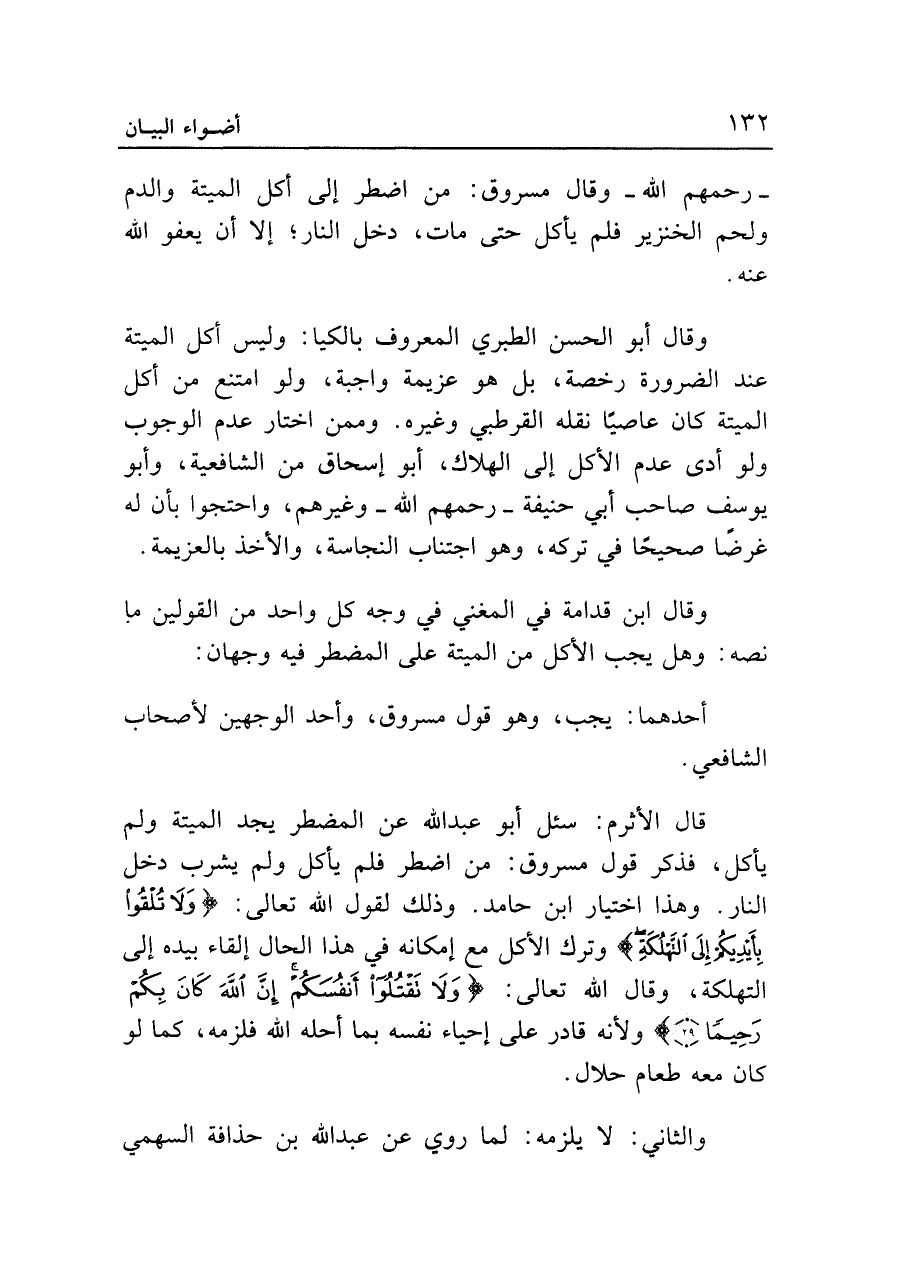 وقال أبو الحسن الطبري المعروف بالكيا: وليس أكل الميتة عند الضرورة رخصة، بل هو عزيمة واجبة، ولو امتنع من أكل الميتة كان عاصيا نقله القرطبي وغيره. وممن اختار عدم الوجوب ولو أدى عدم الأكل إلى الهلاك، أبو إسحاق من الشافعية، وأبو يوسف صاحب أبي حنيفة -رحمهم الله- وغيرهم، واحتجوا بأن له غرضا صحيحا في تركه، وهو اجتناب النجاسة، والأخذ بالعزيمة.
