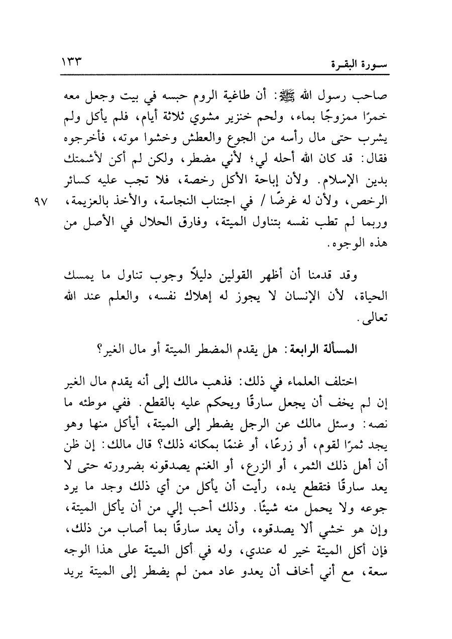 وقد قدمنا أن أظهر القولين دليلا وجوب تناول ما يمسك الحياة، لأن الإنسان لا يجوز له إهلاك نفسه، والعلم عند الله تعالى.