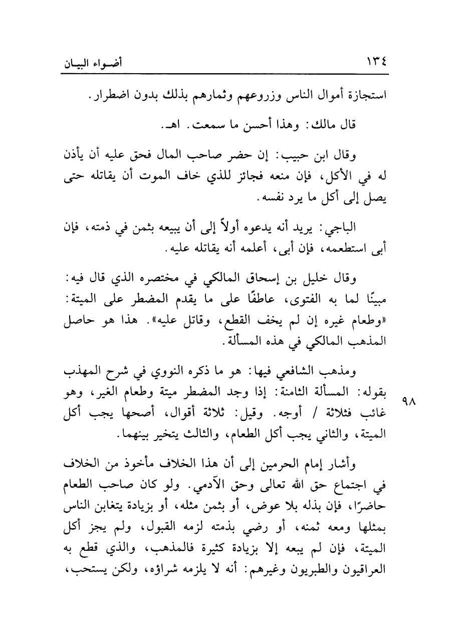 وأشار إمام الحرمين إلى أن هذا الخلاف مأخوذ من الخلاف في اجتماع حق الله تعالى وحق الآدمي. ولو كان صاحب الطعام حاضرا، فإن بذله بلا عوض، أو بثمن مثله، أو بزيادة يتغابن الناس بمثلها ومعه ثمنه، أو رضي بذمته لزمه القبول، ولم يجز أكل الميتة، فإن لم يبعه إلا بزيادة كثيرة فالمذهب، والذي قطع به العراقيون والطبريون وغيرهم: أنه لا يلزمه شراؤه، ولكن يستحب،