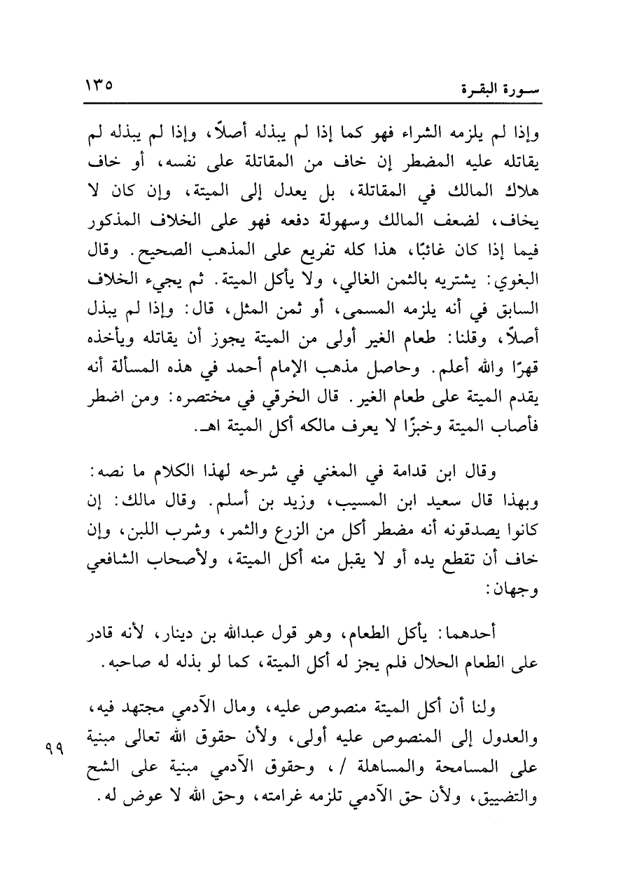 وإذا لم يلزمه الشراء فهو كما إذا لم يبذله أصلا، وإذا لم يبذله لم يقاتله عليه المضطر إن خاف من المقاتلة على نفسه، أو خاف هلاك المالك في المقاتلة، بل يعدل إلى الميتة، وإن كان لا يخاف، لضعف المالك وسهولة دفعه فهو على الخلاف المذكور فيما إذا كان غائبا، هذا كله تفريع على المذهب الصحيح. وقال البغوي: يشتريه بالثمن الغالي، ولا يأكل الميتة. ثم يجىء الخلاف السابق في أنه يلزمه المسمى، أو ثمن المثل، قال: وإذا لم يبذل أصلا، وقلنا: طعام الغير أولى من الميتة يجوز أن يقاتله ويأخذه قهرا والله أعلم. وحاصل مذهب الإمام أحمد في هذه المسألة أنه يقدم الميتة على طعام الغير. قال الخرقي في مختصره: ومن اضطر فأصاب الميتة وخبزا لا يعرف مالكه أكل الميتة اهـ.