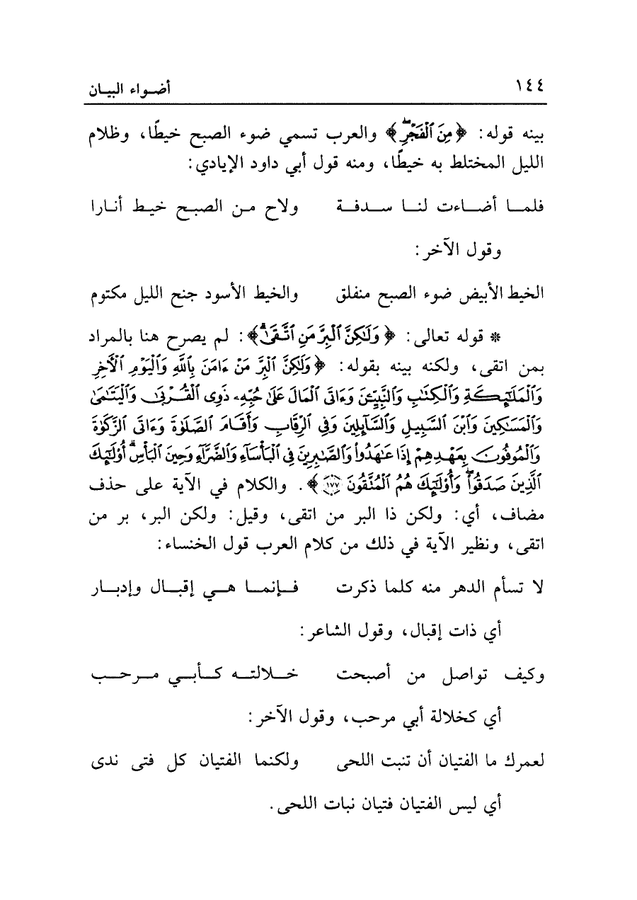 • قوله تعالى: {وَلَكِنَّ الْبِرَّ مَنِ اتَّقَى}: لم يصرح هنا بالمراد بمن اتقى، ولكنه بينه بقوله: {وَلَكِنَّ الْبِرَّ مَنْ آمَنَ بِاللَّهِ وَالْيَوْمِ الْآخِرِ وَالْمَلائِكَةِ وَالْكِتَابِ وَالنَّبِيِّينَ وَآتَى الْمَالَ عَلَى حُبِّهِ ذَوِي الْقُرْبَى وَالْيَتَامَى وَالْمَسَاكِينَ وَابْنَ السَّبِيلِ وَالسَّائِلِينَ وَفِي الرِّقَابِ وَأَقَامَ الصَّلاةَ وَآتَى الزَّكَاةَ وَالْمُوفُونَ بِعَهْدِهِمْ إِذَا عَاهَدُوا وَالصَّابِرِينَ فِي الْبَأْسَاءِ وَالضَّرَّاءِ وَحِينَ الْبَأْسِ أُولَئِكَ الَّذِينَ صَدَقُوا وَأُولَئِكَ هُمُ الْمُتَّقُونَ (١٧٧)} [البقرة: ١٧٧]. والكلام في الآية على حذف مضاف، أي: ولكن ذا البر من اتقى، وقيل: ولكن البر، بر من اتقى، ونظير الآية في ذلك من كلام العرب قول الخنساء: