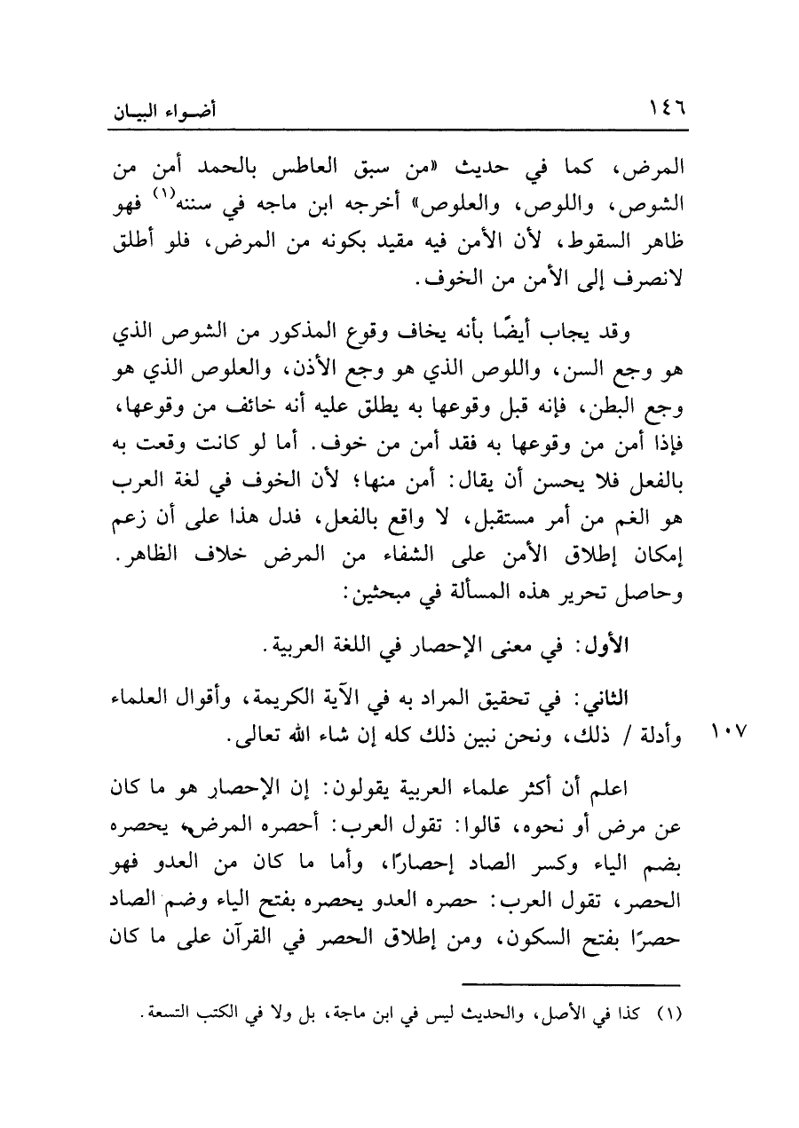 وقد يجاب أيضا بأنه يخاف وقوع المذكور من الشوص الذي هو وجع السن، واللوص الذي هو وجع الأذن، والعلوص الذي هو وجع البطن، فإنه قبل وقوعها به يطلق عليه أنه خائف من وقوعها، فإذا أمن من وقوعها به فقد أمن من خوف. أما لو كانت وقعت به بالفعل فلا يحسن أن يقال: أمن منها؛ لأن الخوف في لغة العرب هو الغم من أمر مستقبل، لا واقع بالفعل، فدل هذا على أن زعم إمكان إطلاق الأمن على الشفاء من المرض خلاف الظاهر.
