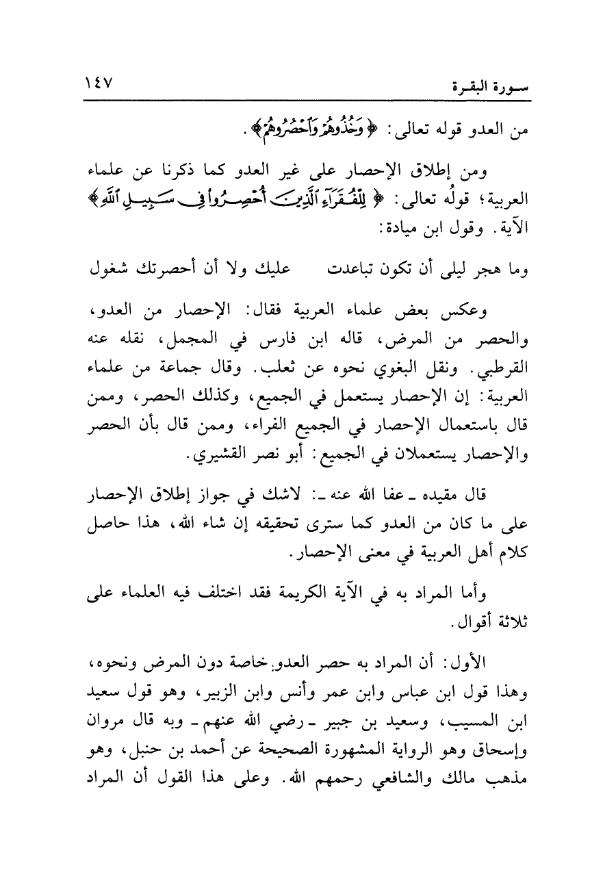 الأول: أن المراد به حصر العدو خاصة دون المرض ونحوه، وهذا قول ابن عباس وابن عمر وأنس وابن الزبير، وهو قول سعيد بن المسيب، وسعيد بن جبير -رضي الله عنهم- وبه قال مروان وإسحاق وهو الرواية المشهورة الصحيحة عن أحمد بن حنبل، وهو مذهب مالك والشافعي رحمهم الله. وعلى هذا القول أن المراد