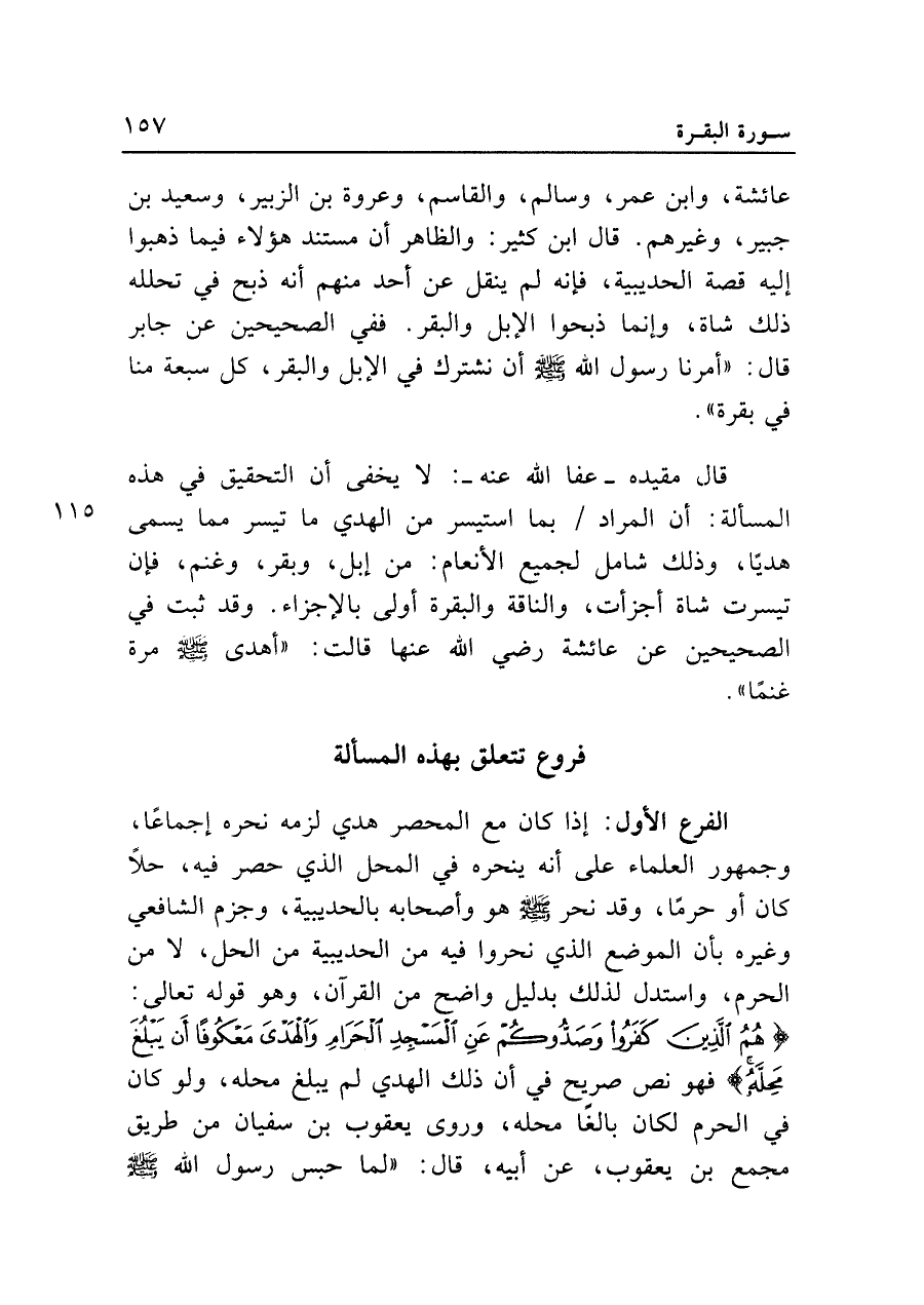 عائشة، وابن عمر، وسالم، والقاسم، وعروة بن الزبير، وسعيد بن جبير، وغيرهم. قال ابن كثير: والظاهر أن مستند هؤلاء فيما ذهبوا إليه قصة الحديبية، فإنه لم ينقل عن أحد منهم أنه ذبح في تحلله ذلك شاة، وإنما ذبحوا الإبل والبقر. ففي الصحيحين عن جابر قال: "أمرنا رسول الله - صلى الله عليه وسلم - أن نشترك في الإبل والبقر، كل سبعة منا في بقرة".
