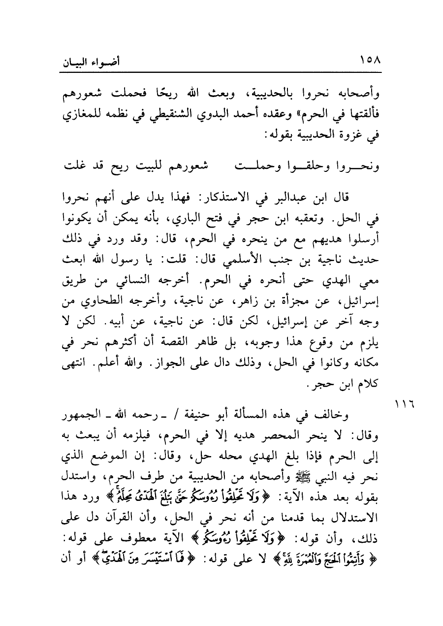وأصحابه نحروا بالحديبية، وبعث الله ريحا فحملت شعورهم فألقتها في الحرم" وعقده أحمد البدوي الشنقيطي في نظمه للمغازي في غزوة الحديبية بقوله: