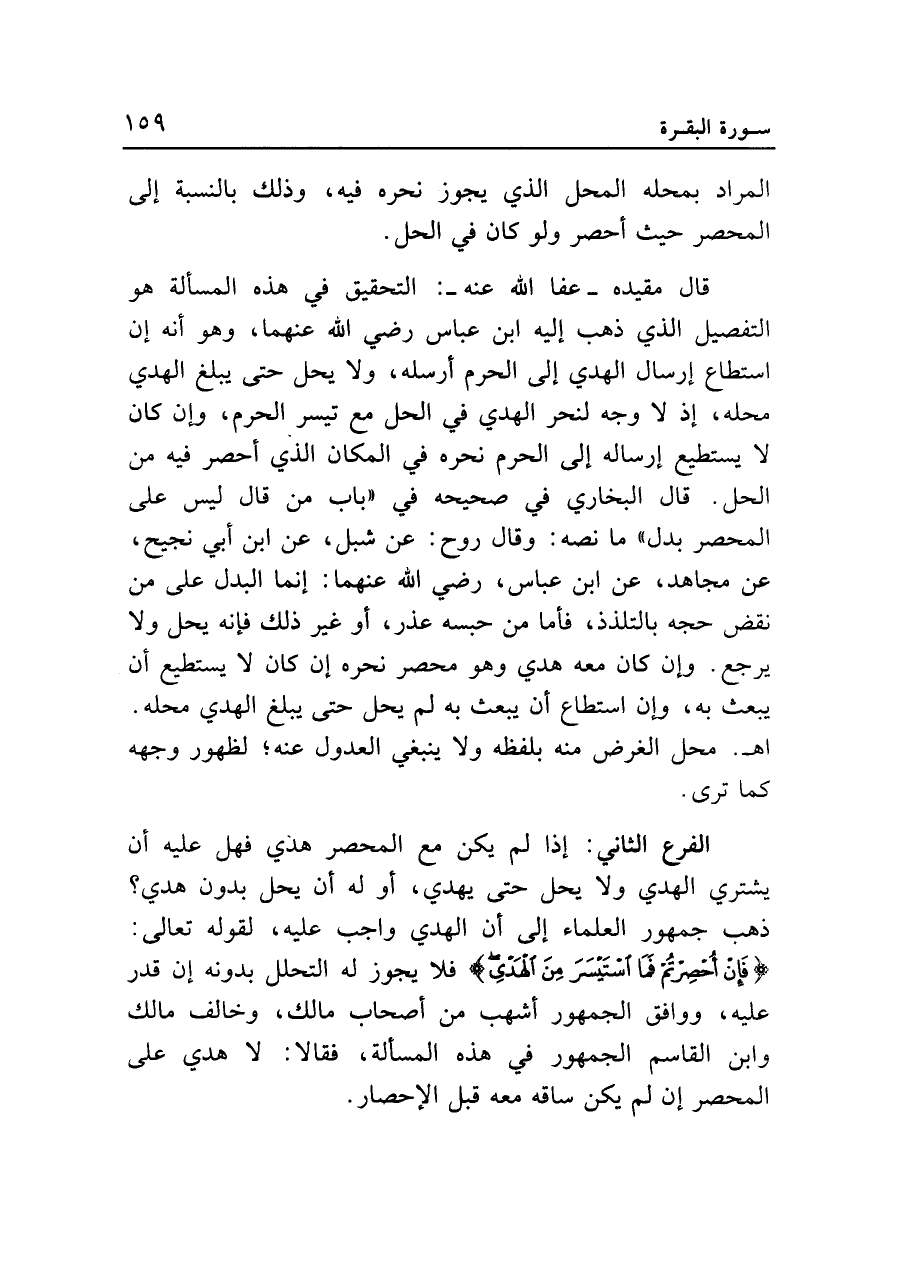 قال مقيده - عفا الله عنه -: التحقيق في هذه المسألة هو التفصيل الذي ذهب إليه ابن عباس رضي الله عنهما، وهو أنه إن استطاع إرسال الهدي إلى الحرم أرسله، ولا يحل حتى يبلغ الهدي محله، إذ لا وجه لنحر الهدي في الحل مع تيسر الحرم، وإن كان لا يستطيع إرساله إلى الحرم نحره في المكان الذي أحصر فيه من الحل. قال البخاري في صحيحه في "باب من قال ليس على المحصر بدل" ما نصه: وقال روح: عن شبل، عن ابن أبي نجيح، عن مجاهد، عن ابن عباس، رضي الله عنهما: إنما البدل على من نقض حجه بالتلذذ، فأما من حبسه عذر، أو غير ذلك فإنه يحل ولا يرجع. وإن كان معه هدي وهو محصر نحره إن كان لا يستطيع أن يبعث به، وإن استطاع أن يبعث به لم يحل حتى يبلغ الهدي محله. اهـ. محل الغرض منه بلفظه ولا ينبغي العدول عنه؛ لظهور وجهه كما ترى.