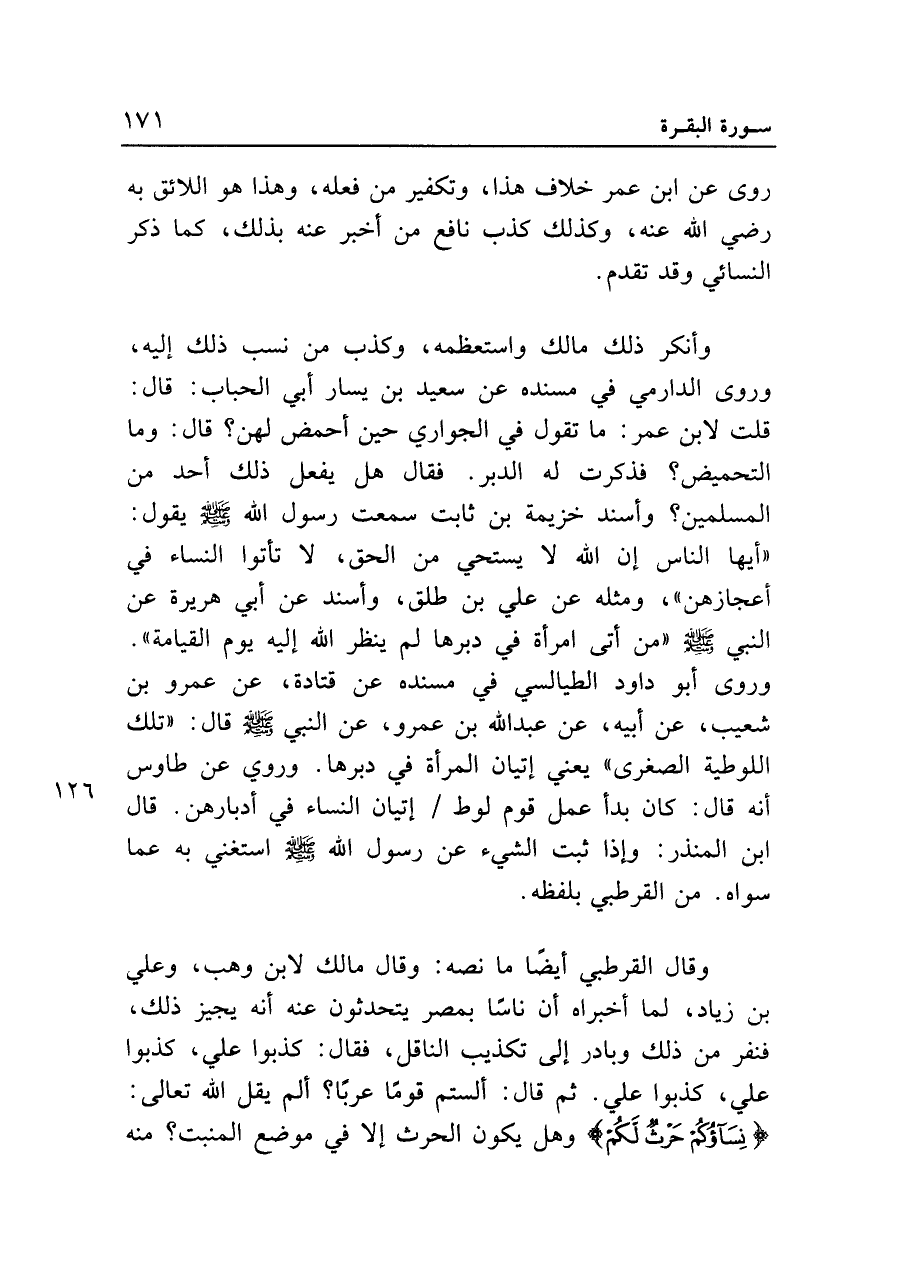 وقال القرطبي أيضا ما نصه: وقال مالك لابن وهب، وعلي بن زياد، لما أخبراه أن ناسا بمصر يتحدثون عنه أنه يجيز ذلك، فنفر من ذلك وبادر إلى تكذيب الناقل، فقال: كذبوا علي، كذبوا علي، كذبوا علي. ثم قال: ألستم قوما عربا؟ ألم يقل الله تعالى: {نِسَاؤُكُمْ حَرْثٌ لَكُمْ} وهل يكون الحرث إلا في موضع المنبت؟ منه
