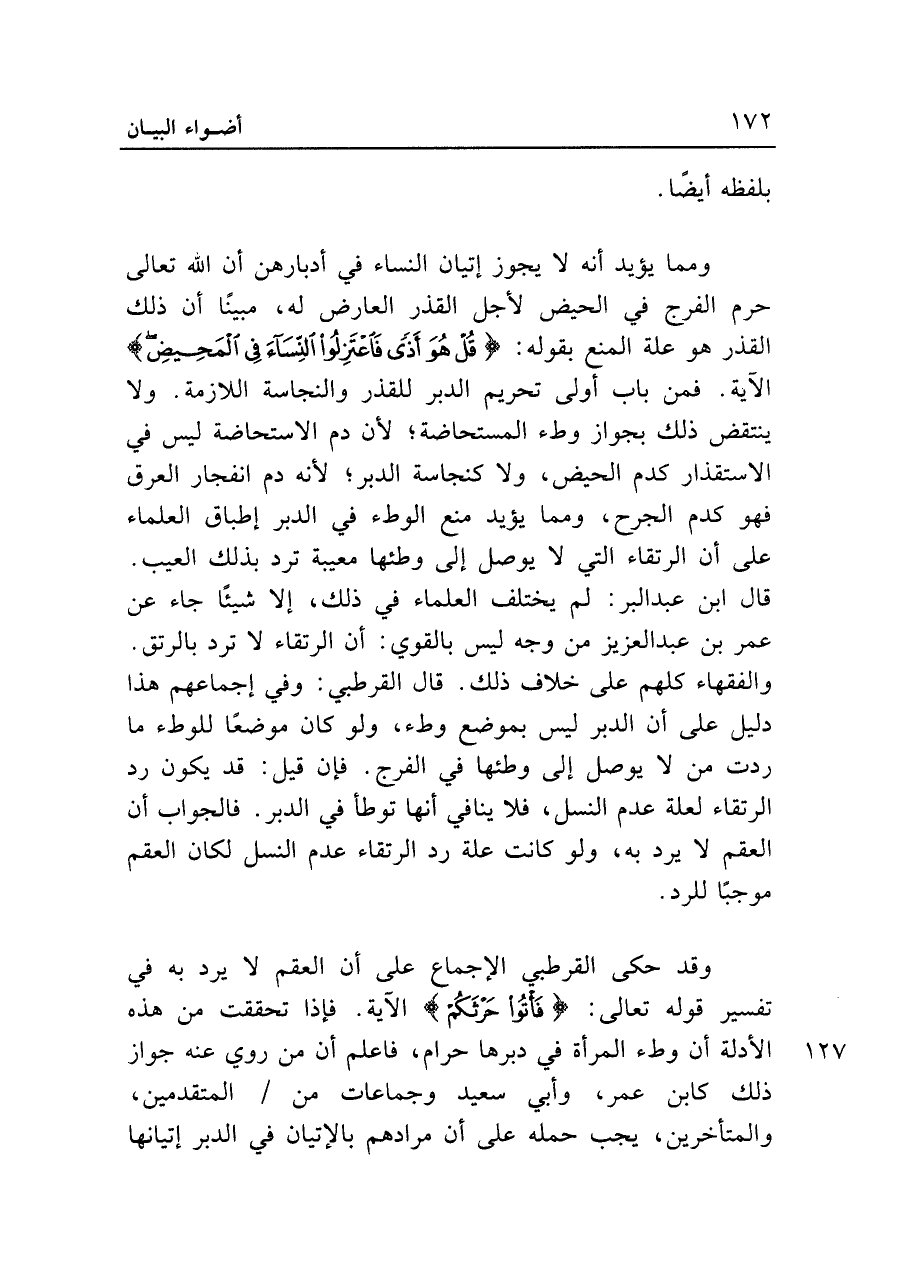 ومما يؤيد أنه لا يجوز إتيان النساء في أدبارهن أن الله تعالى حرم الفرج في الحيض لأجل القذر العارض له، مبينا أن ذلك القذر هو علة المنع بقوله: {قُلْ هُوَ أَذىً فَاعْتَزِلُوا النِّسَاءَ فِي الْمَحِيضِ} الآية. فمن باب أولى تحريم الدبر للقذر والنجاسة اللازمة. ولا ينتقض ذلك بجواز وطء المستحاضة؛ لأن دم الإستحاضة ليس في الاستقذار كدم الحيض، ولا كنجاسة الدبر؛ لأنه دم انفجار العرق فهو كدم الجرح، ومما يؤيد منع الوطء في الدبر إطباق العلماء على أن الرتقاء التي لا يوصل إلى وطئها معيبة ترد بذلك العيب. قال ابن عبد البر: لم يختلف العلماء في ذلك، إلا شيئا جاء عن عمر بن عبد العزيز من وجه ليس بالقوي: أن الرتقاء لا ترد بالرتق. والفقهاء كلهم على خلاف ذلك. قال القرطبي: وفي إجماعهم هذا دليل على أن الدبر ليس بموضع وطء، ولو كان موضعا للوطء ما ردت من لا يوصل إلى وطئها في الفرج. فإن قيل: قد يكون رد الرتقاء لعلة عدم النسل، فلا ينافي أنها توطأ في الدبر. فالجواب أن العقم لا يرد به، ولو كانت علة رد الرتقاء عدم النسل لكان العقم موجبا للرد.