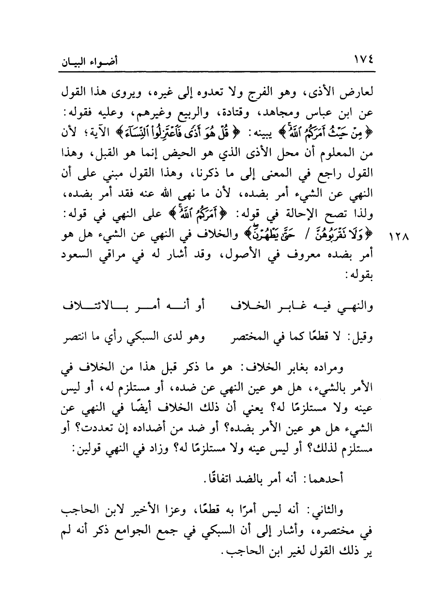 لعارض الأذى، وهو الفرج ولا تعدوه إلى غيره، ويروى هذا القول عن ابن عباس ومجاهد، وقتادة، والربيع وغيرهم، وعليه فقوله: {فَأْتُوهُنَّ مِنْ حَيْثُ أَمَرَكُمُ اللَّه} يبينه: {قُلْ هُوَ أَذىً فَاعْتَزِلُوا النِّسَاءَ} الآية؛ لأن من المعلوم أن محل الأذى الذي هو الحيض إنما هو القبل، وهذا القول راجع في المعنى إلى ما ذكرنا، وهذا القول مبني على أن النهي عن الشيء أمر بضده، لأن ما نهى الله عنه فقد أمر بضده، ولذا تصح الإحالة في قوله: {أَمَرَكُمُ اللَّهُ} على النهي في قوله: {وَلا تَقْرَبُوهُنَّ حَتَّى يَطْهُرْنَ} والخلاف في النهي عن الشيء هل هو أمر بضده معروف في الأصول، وقد أشار له في مراقي السعود بقوله: